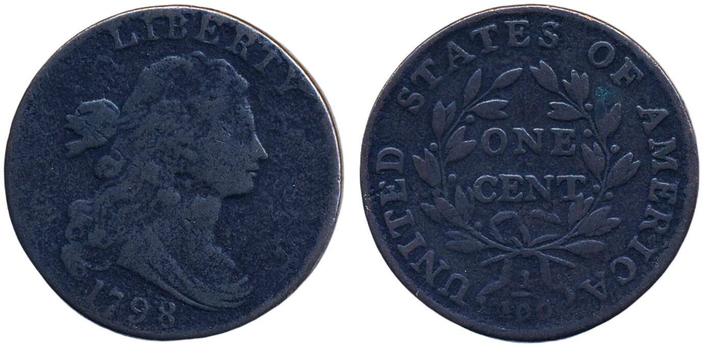 Coins, U.S.A. KM 22, 1 cent 1798. 10.29 g. Light corrosion, verdigris spot on reverse. VG-F.