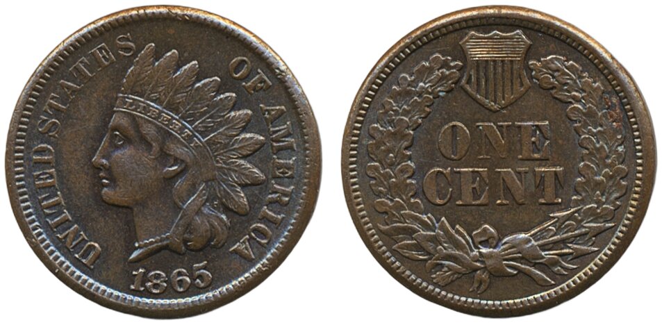 Coins, U.S.A. KM 90a, 1 cent 1865. Lightly cleaned but lustrous high grade example. XF-UNC.