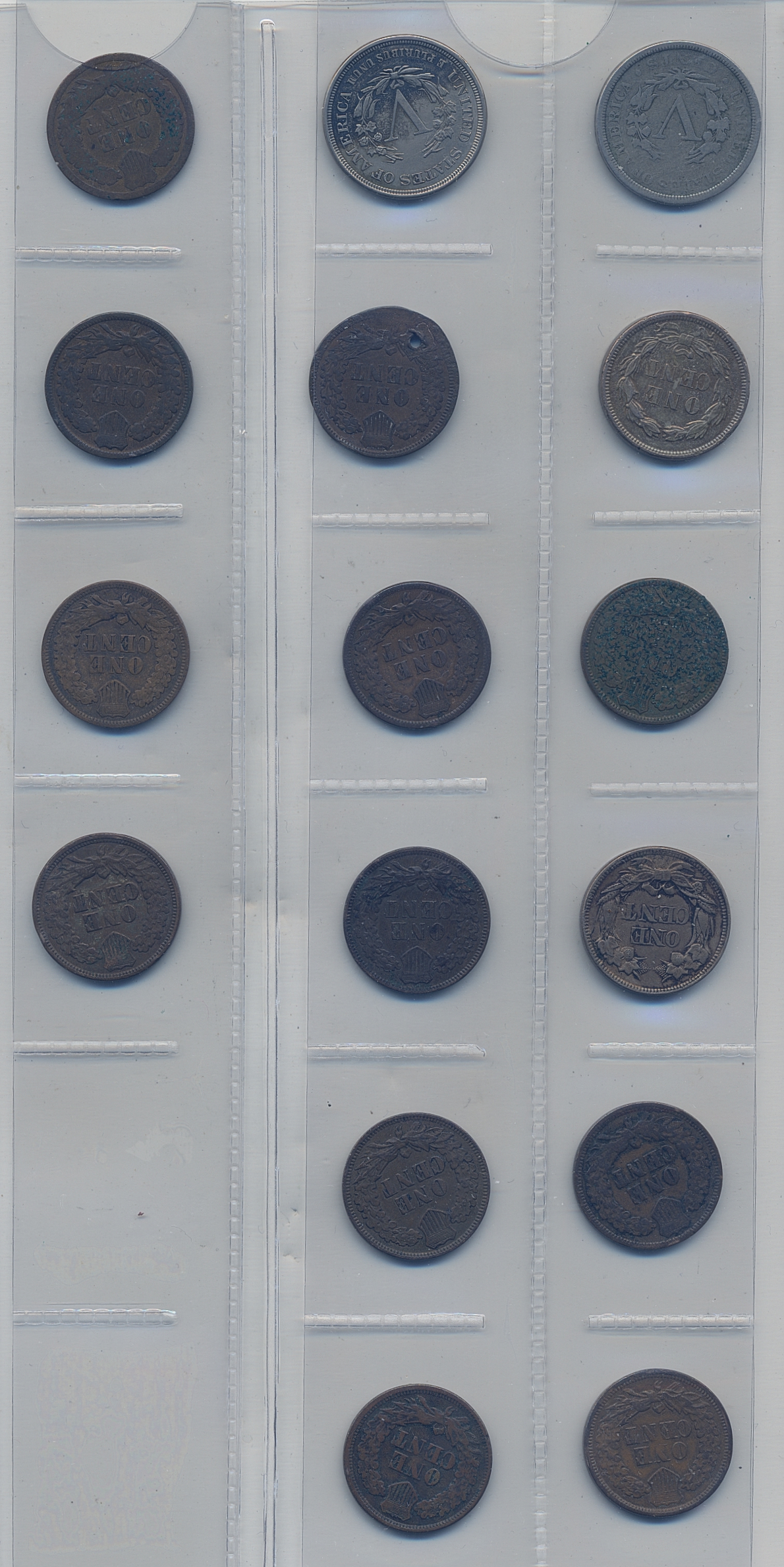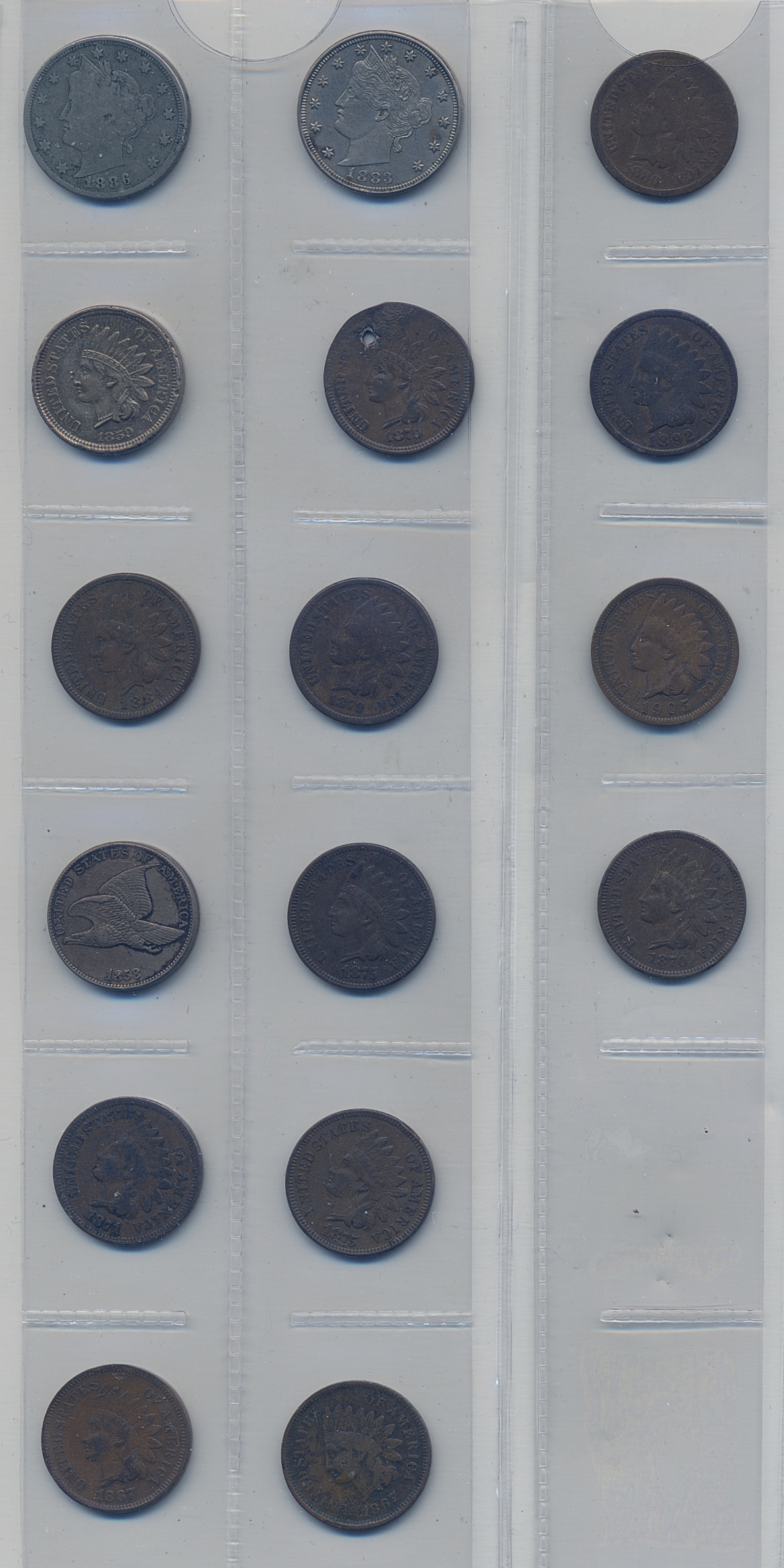 Coins, U.S.A. Lot of 16 copper and base metal coins including several better dates such as 5 cents 1886, 1 cent 1870 and 1871. Please inspect! VG-XF.