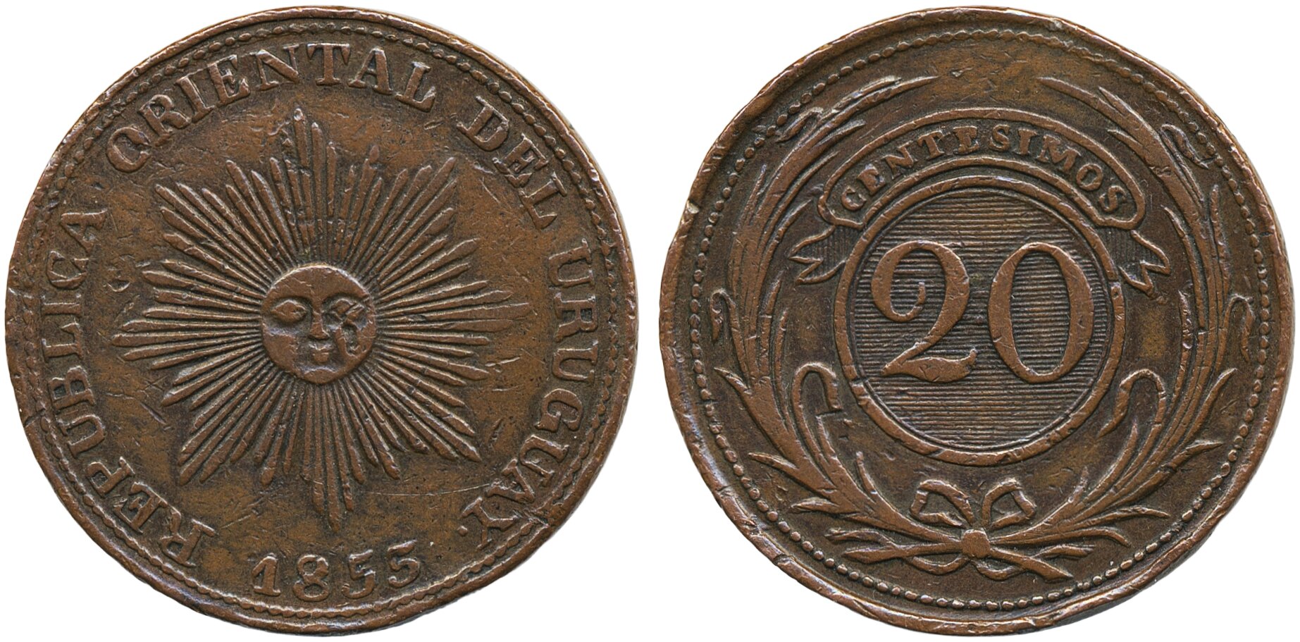 Coins, Uruguay. KM 7, 20 centesimos 1855. VF.