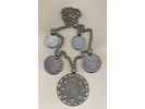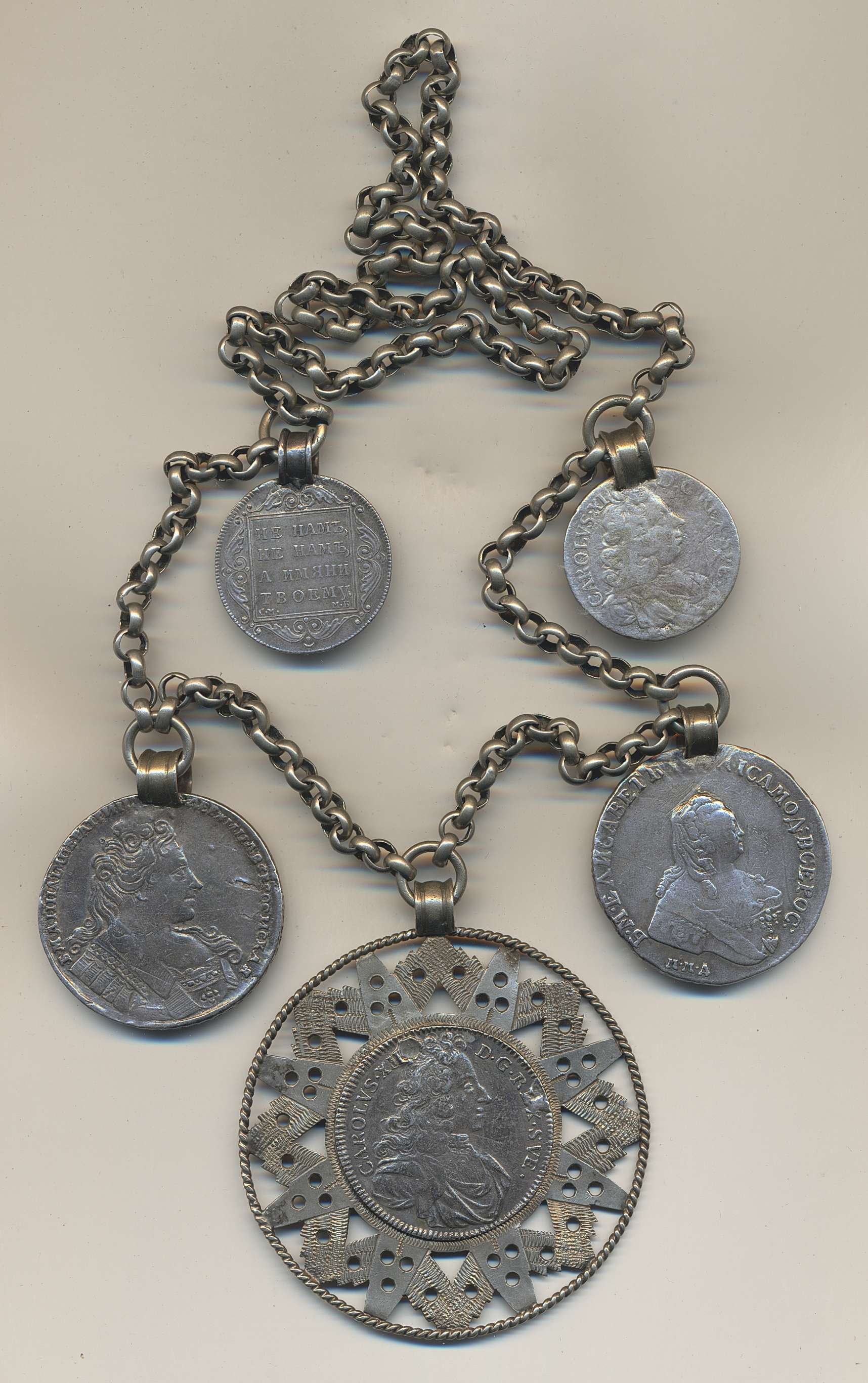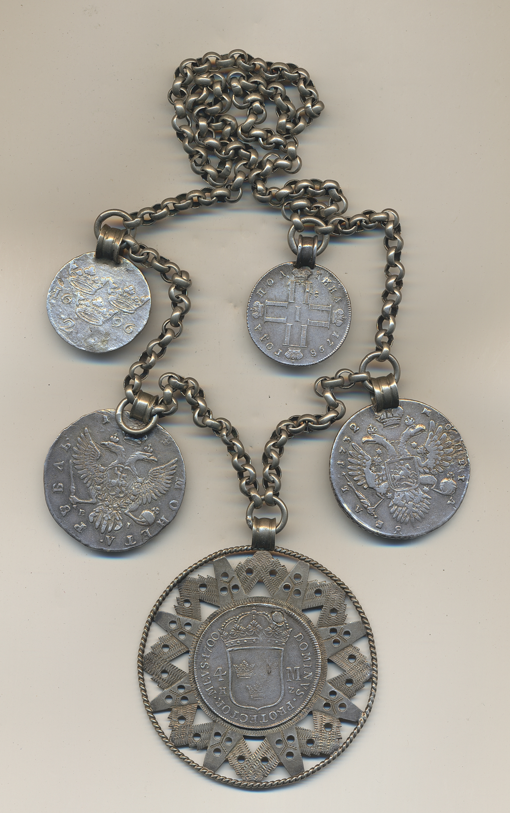 Coins, Europe. Silver chain with five coins in contemporary mounting. Swedish and Russian coins including 4 mark 1700, 2 mark 1696 and Russia 1 rouble 1732/1, 1 rouble 1754 and ¼ rouble 1798. VF.