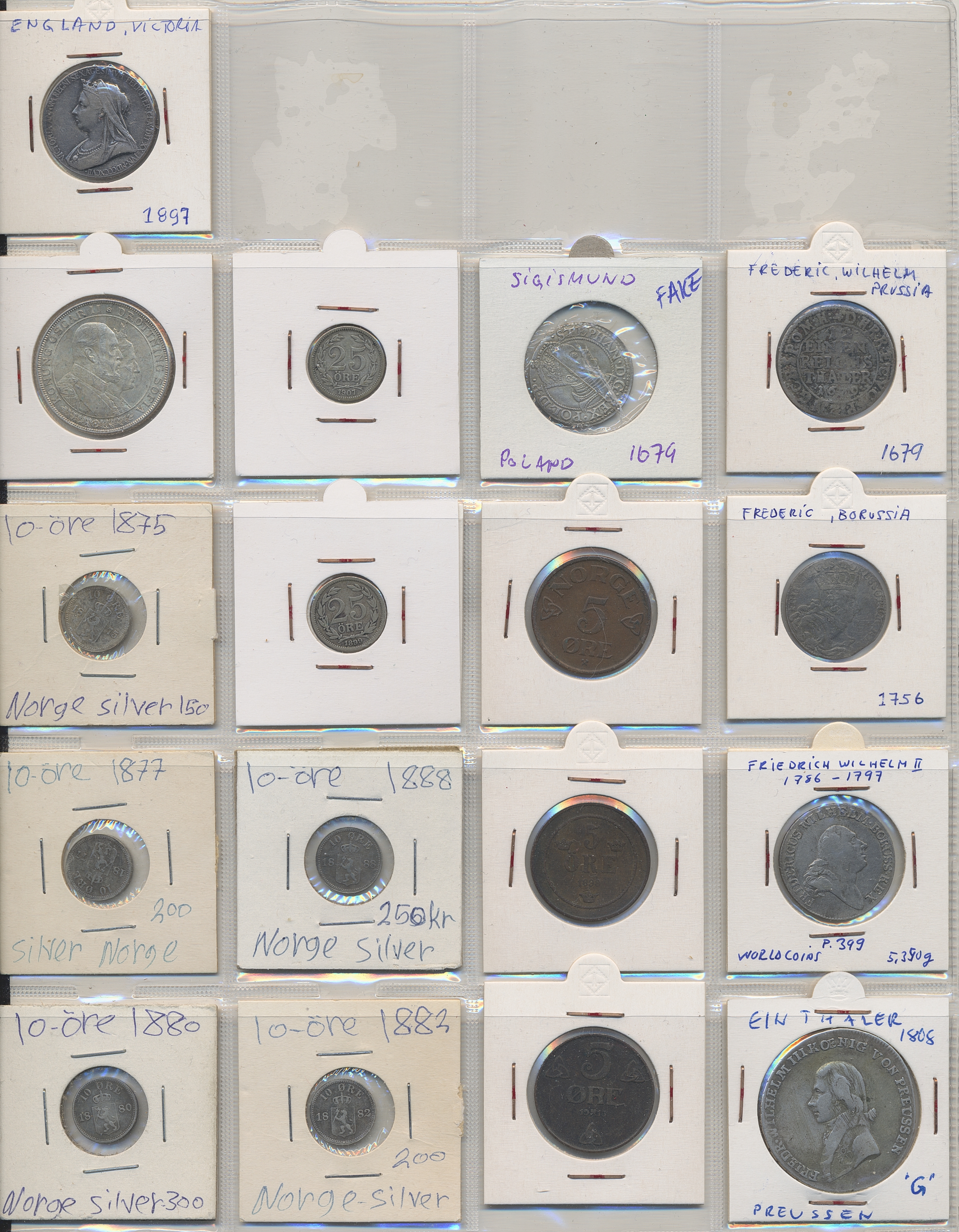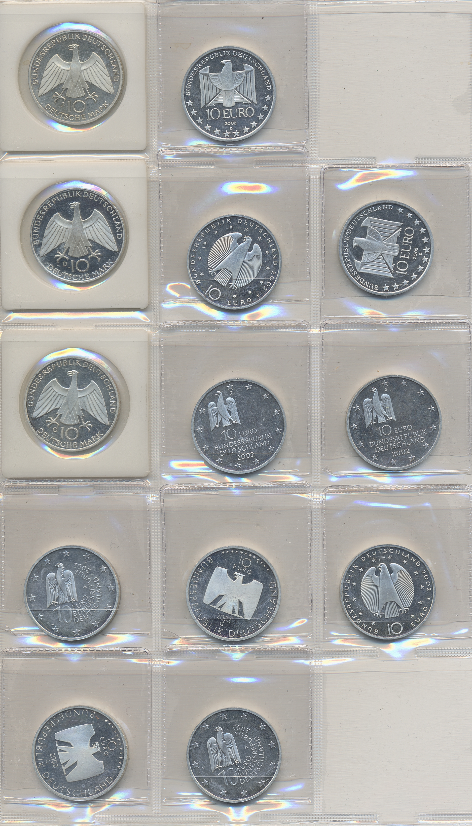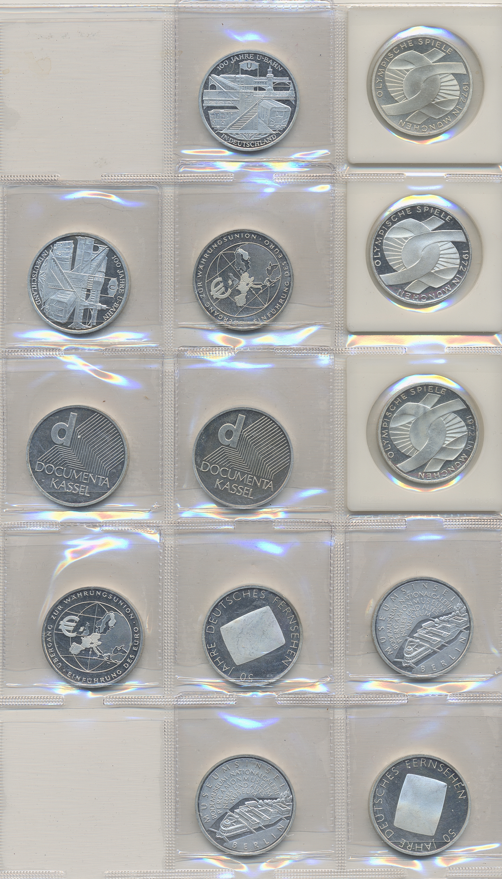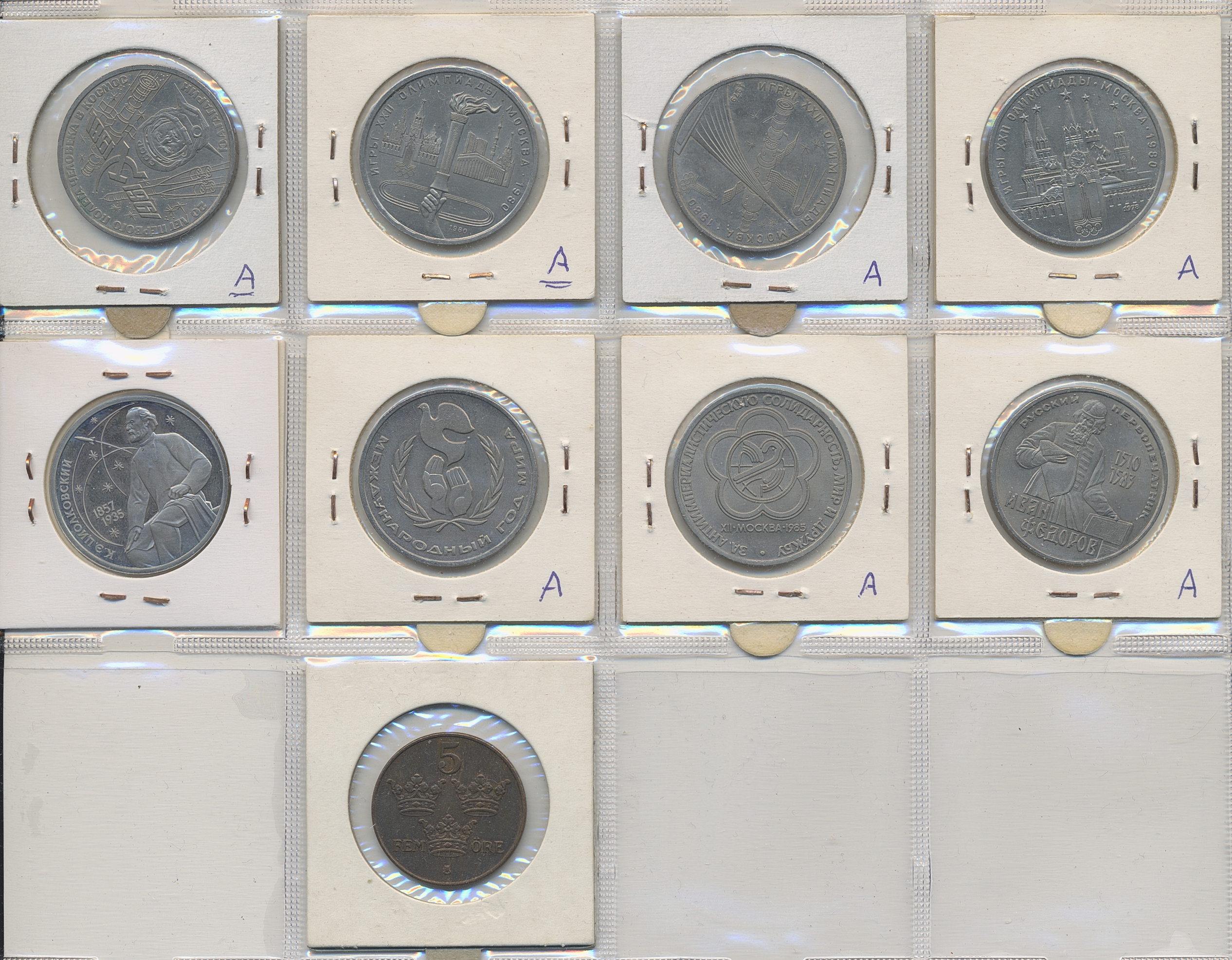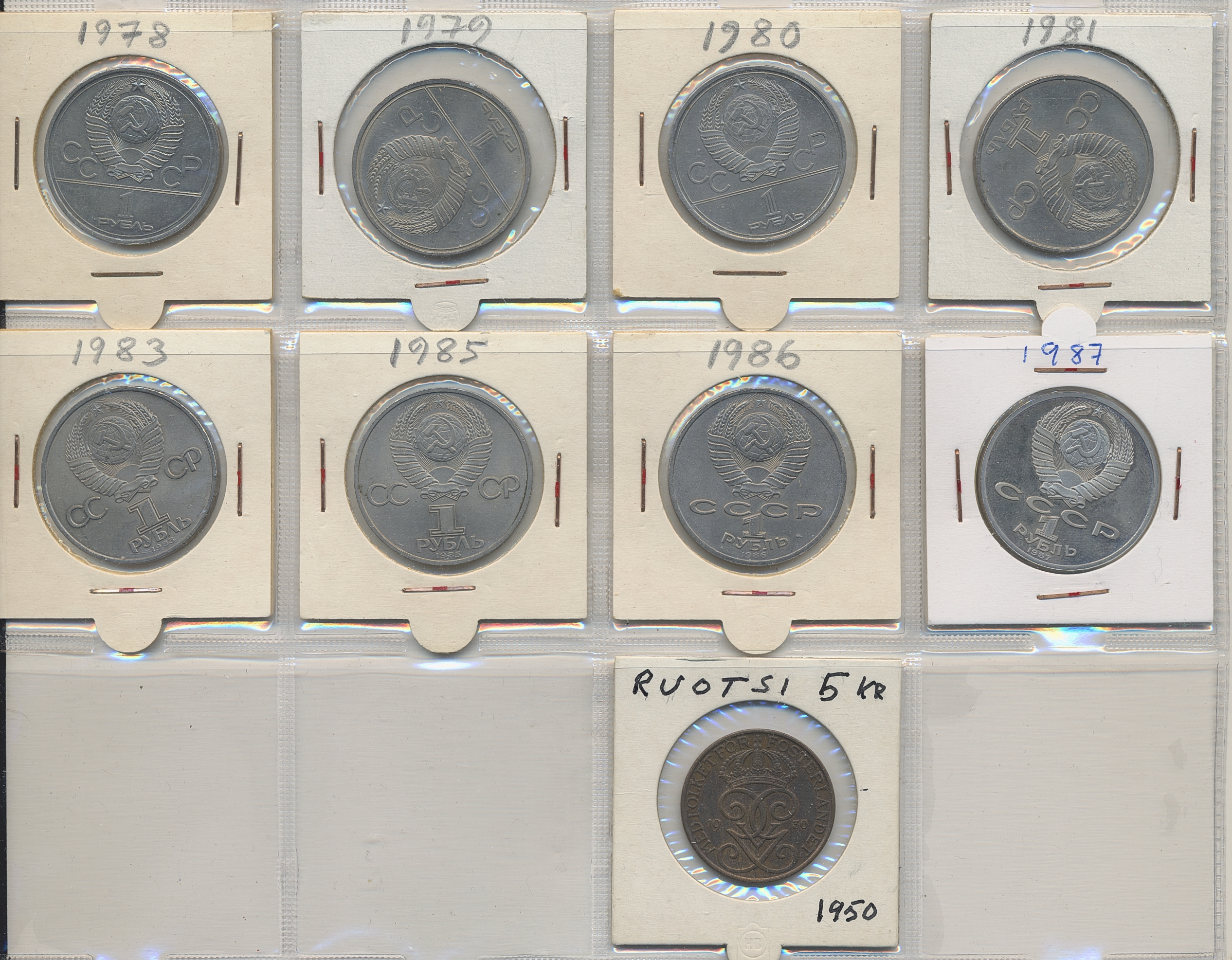 Coins, Europe. Group of coins and banknotes in silver and base metals including ten commemorative 10 euros of Germany, a few Olympic commemoratives in silver, some Norway, Sweden and Germany older silver and base metal coins, etc. Also Russia roubles 1978–1987 in base metal. Please inspect! VG-UNC.