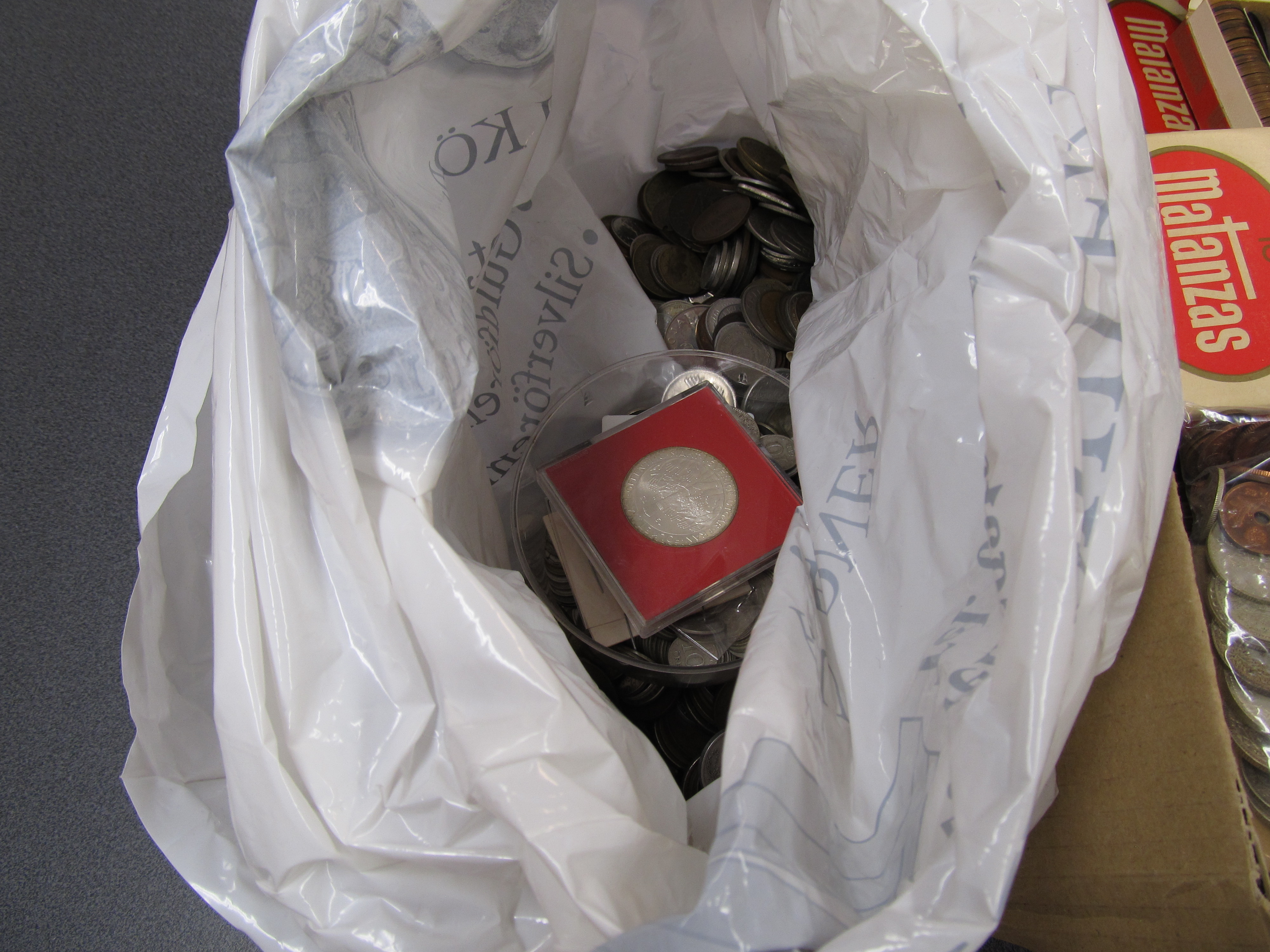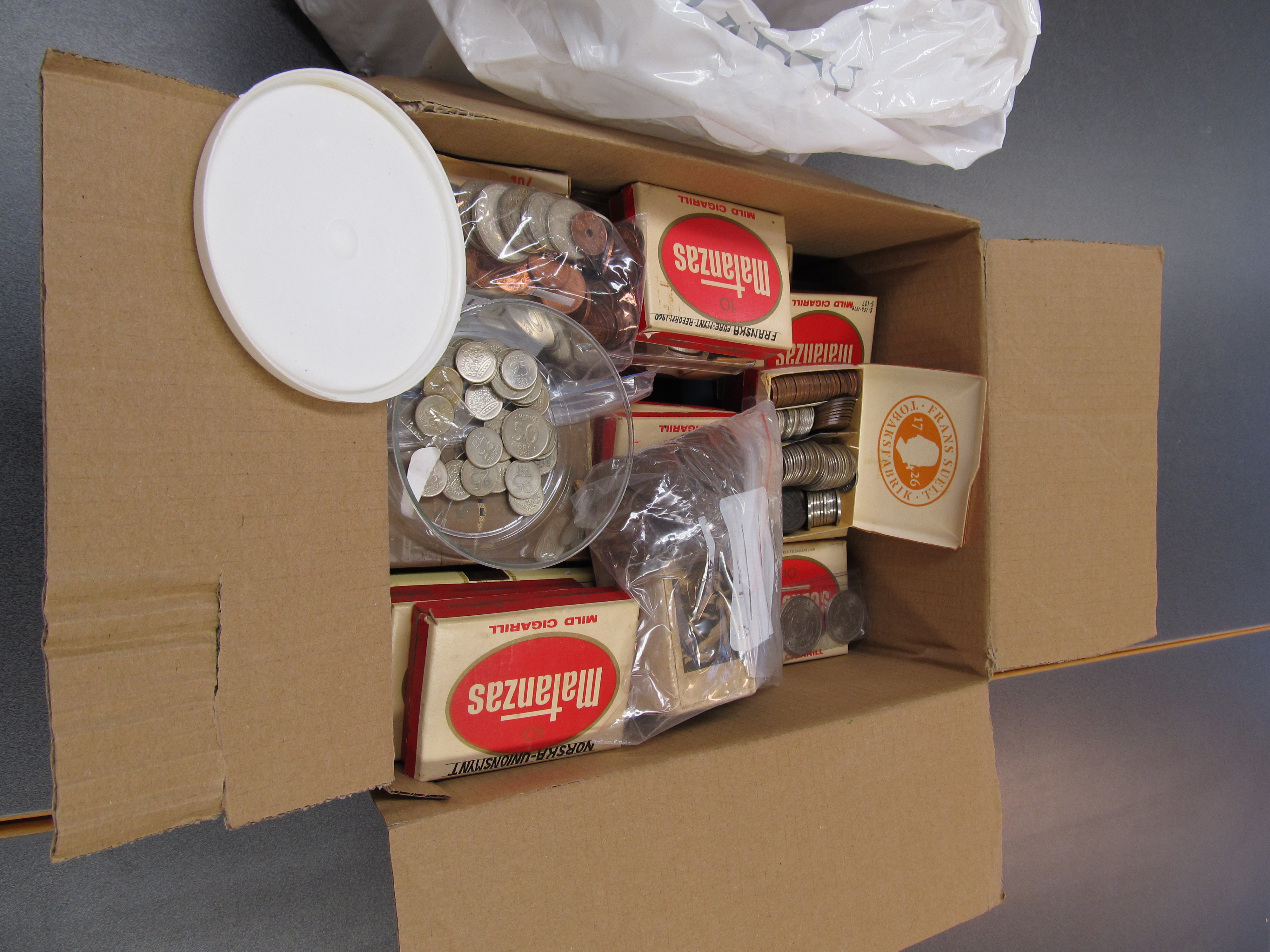 Coins, ALL WORLD. One box with thousands of silver, bronze and coppernickel coins, 1600–1900s, mixed quality. Approx. 15 kg.