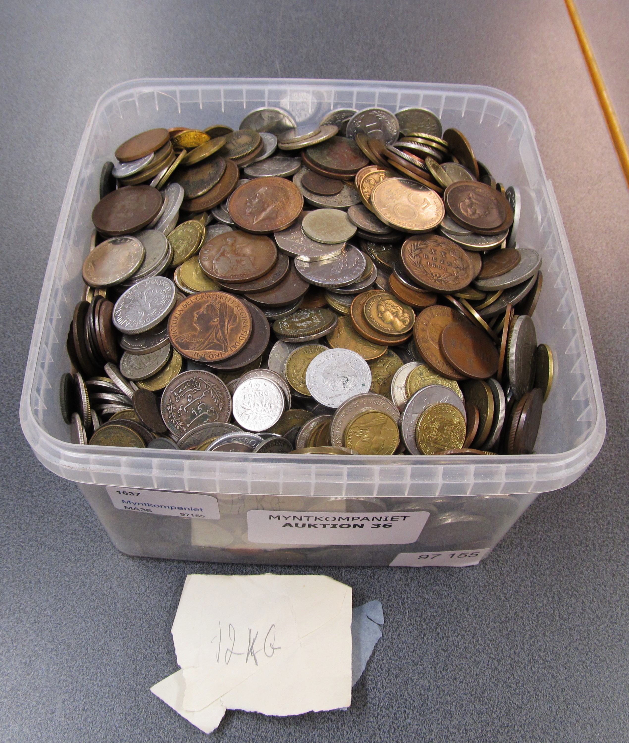 Coins, ALL WORLD. Box with bronze and copper-nickel coins, 1900s, mixed quality. Approx. 12 kg.