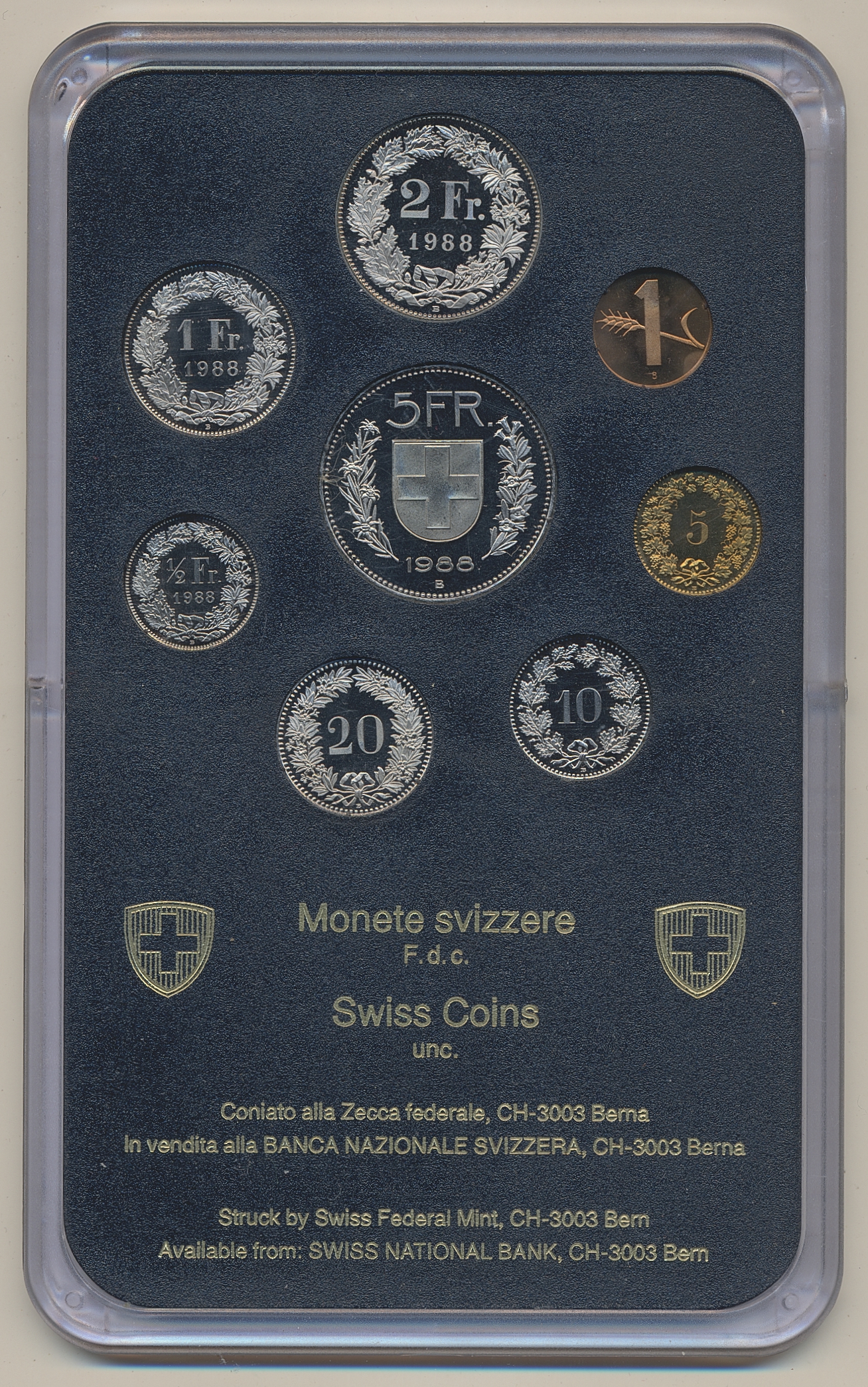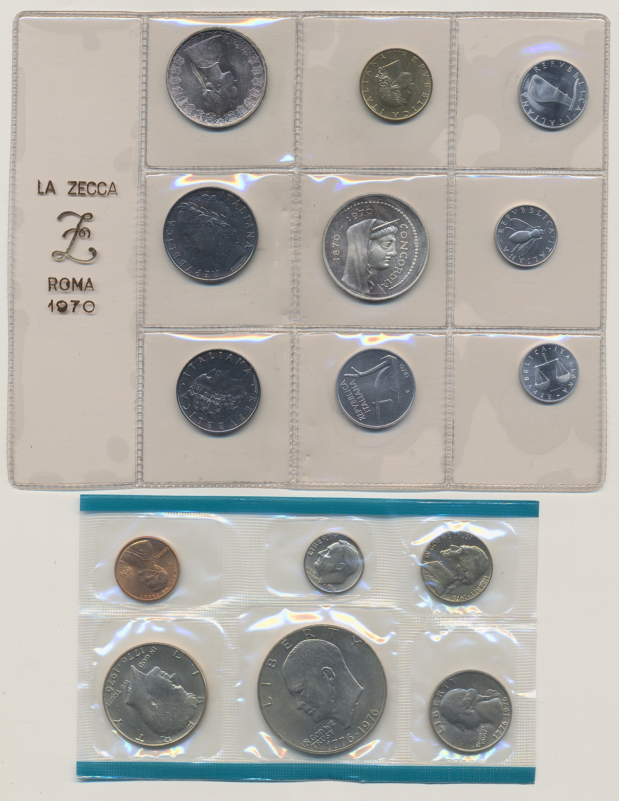 Coins, ALL WORLD. One box with four coin-sets, 1970–2004, Switzerland, USA, Thailand and Italy. UNC.