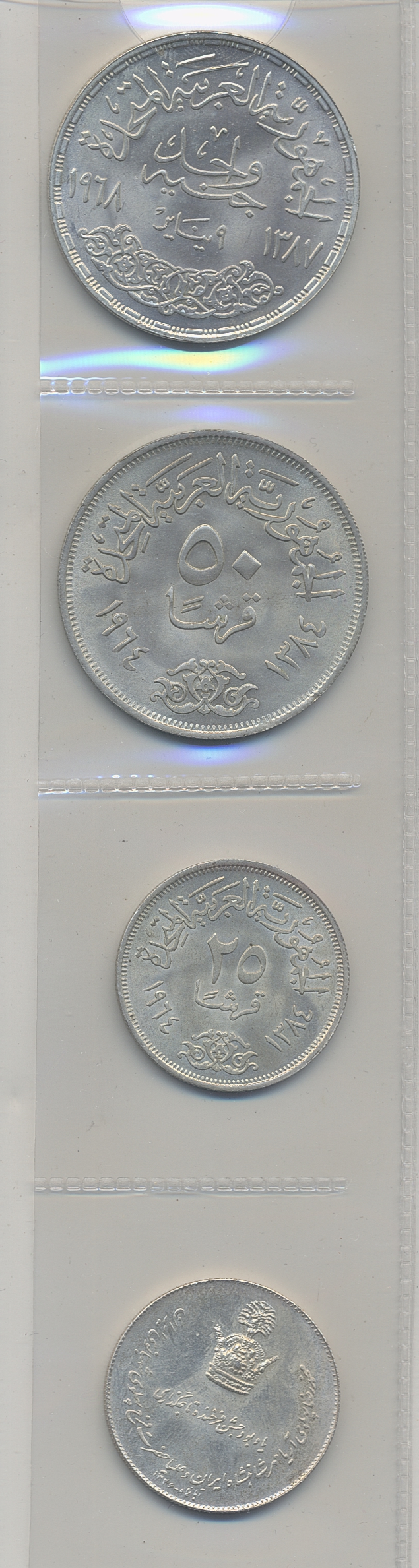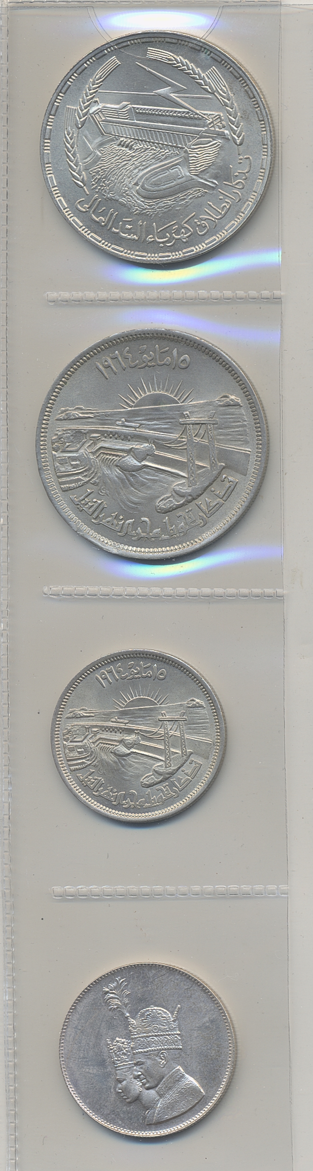 Coins, ALL WORLD, MIDDLE EAST. Small group of four silver coins. Egypt 1 pound 1968, 1 pound 1964, 50 cents 1964 and a Persia Coronation medal 1967 in silver. XF-UNC.