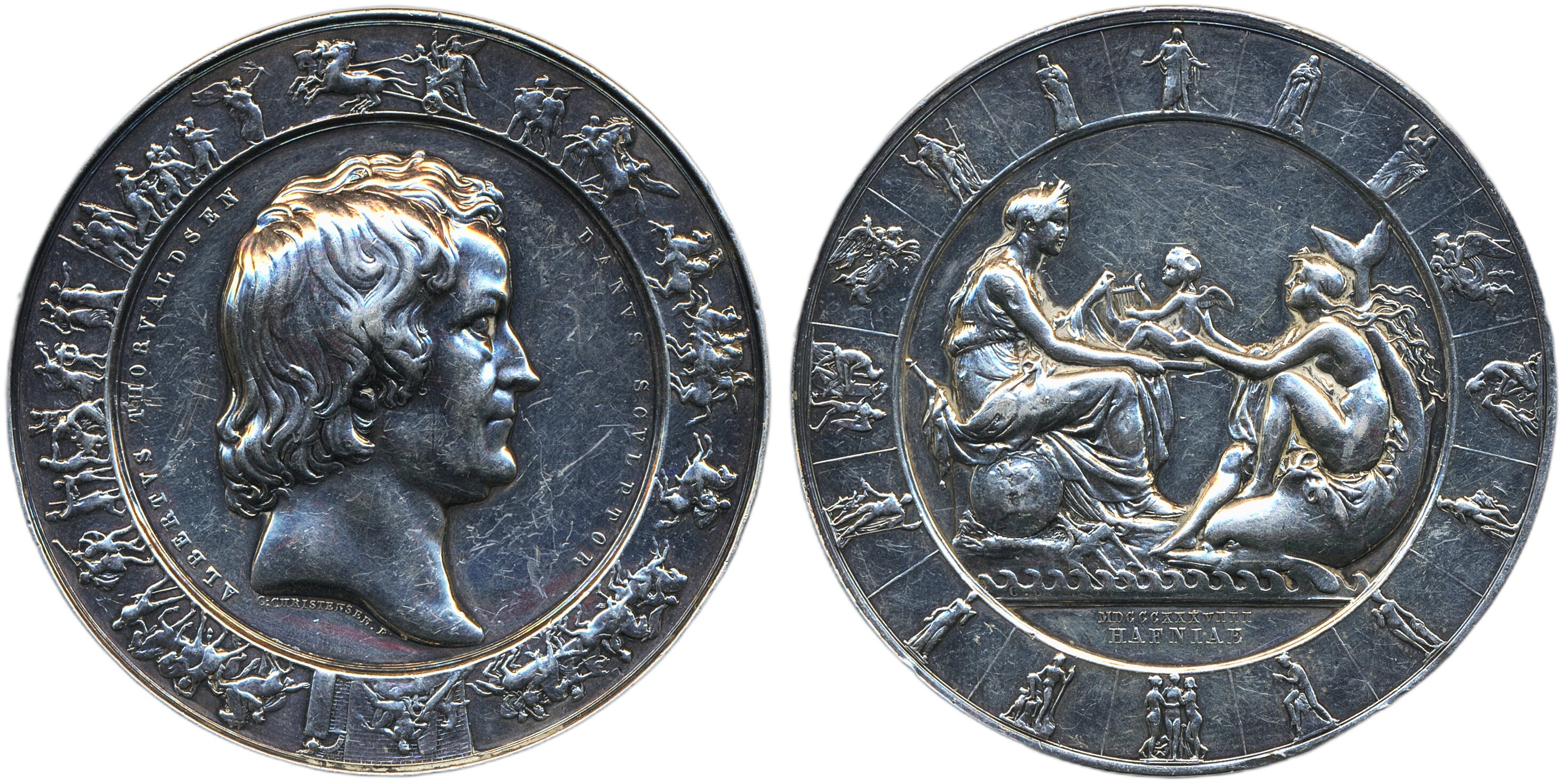 Medals, non-regal, Denmark. Silver medal 1838 by C. Christensen depicting Albert Thorvaldsen (1770–1844), 61 mm, 146.58 g. Prize medal for Royal Academy of Arts (HAFNIAE). Awarded 1884 to Aug Jerndorff (inscription on edge). Cleaned/polished. 1+.