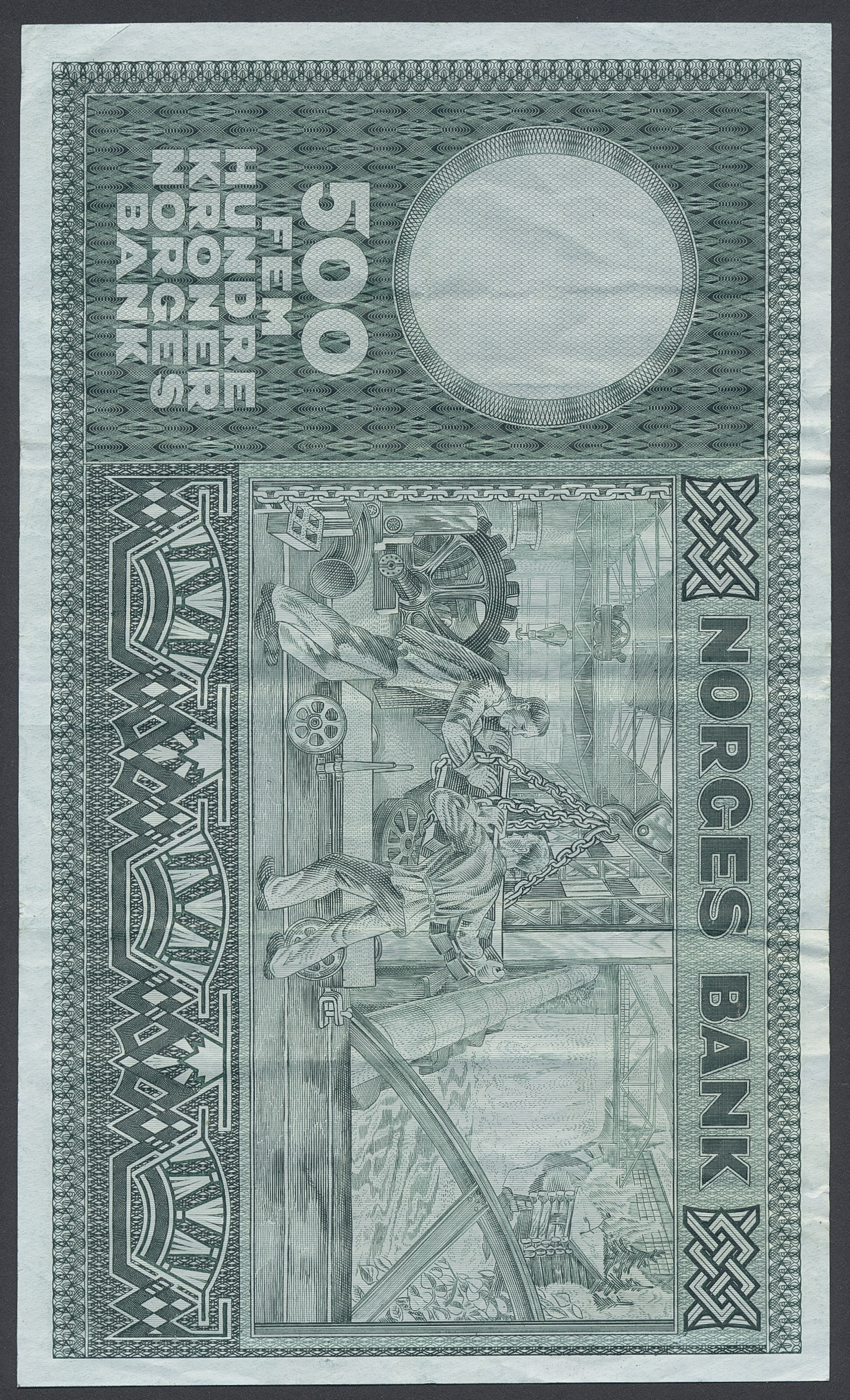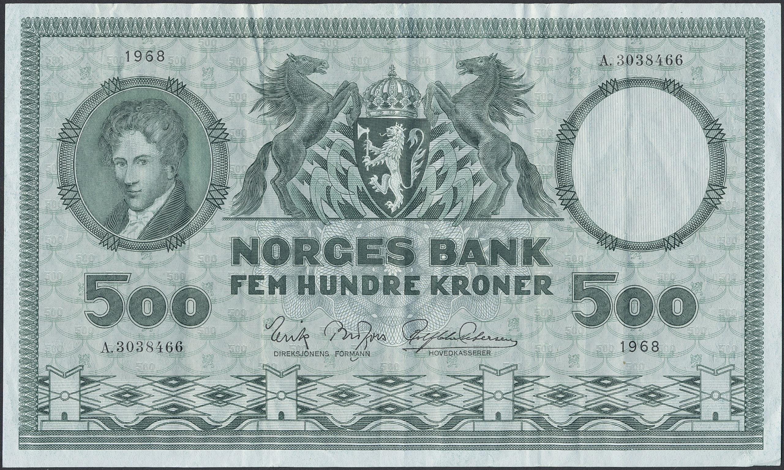 Banknotes, Norway. Pick 34d, 500 kroner 1968. A3038466. 1/1+.