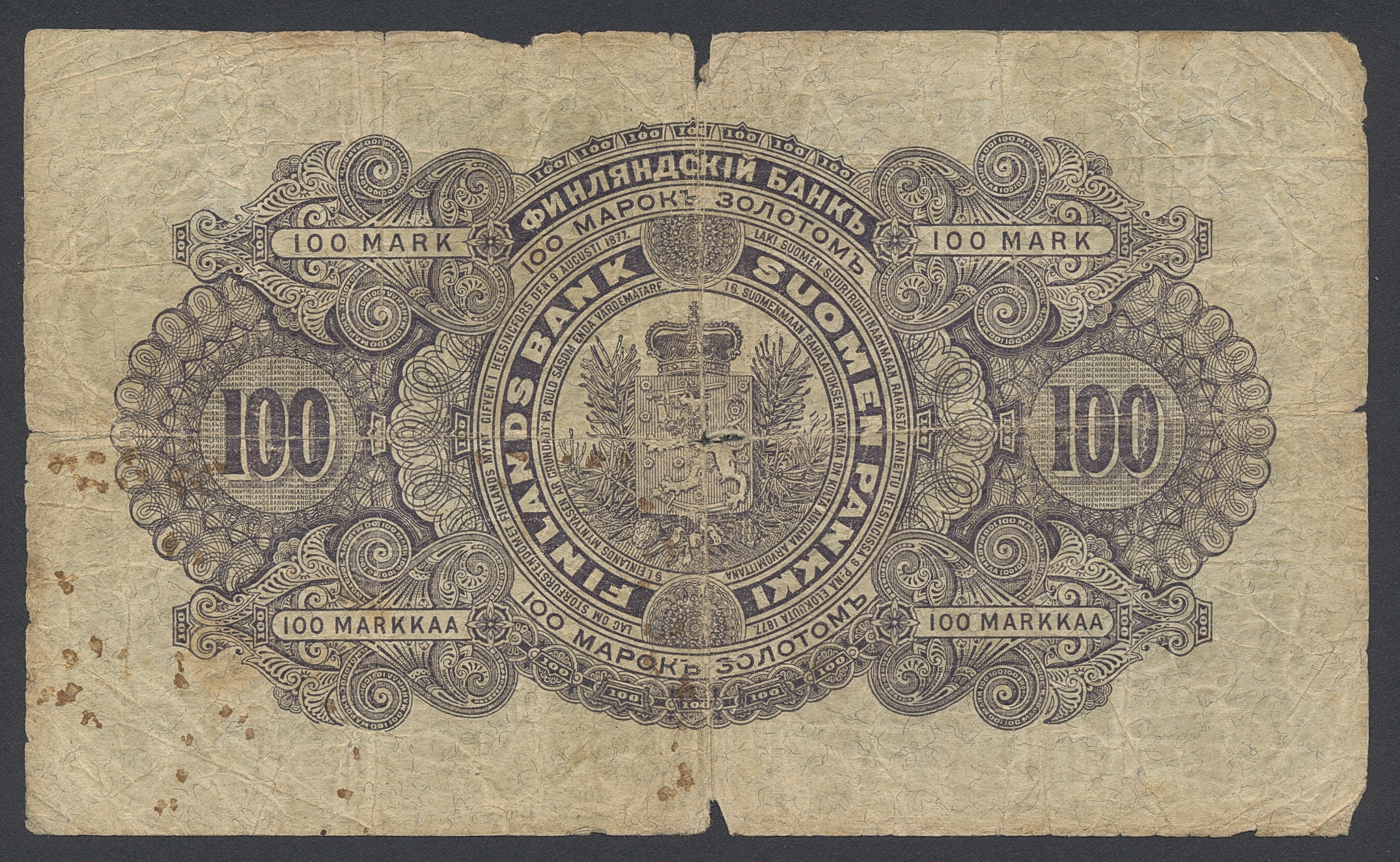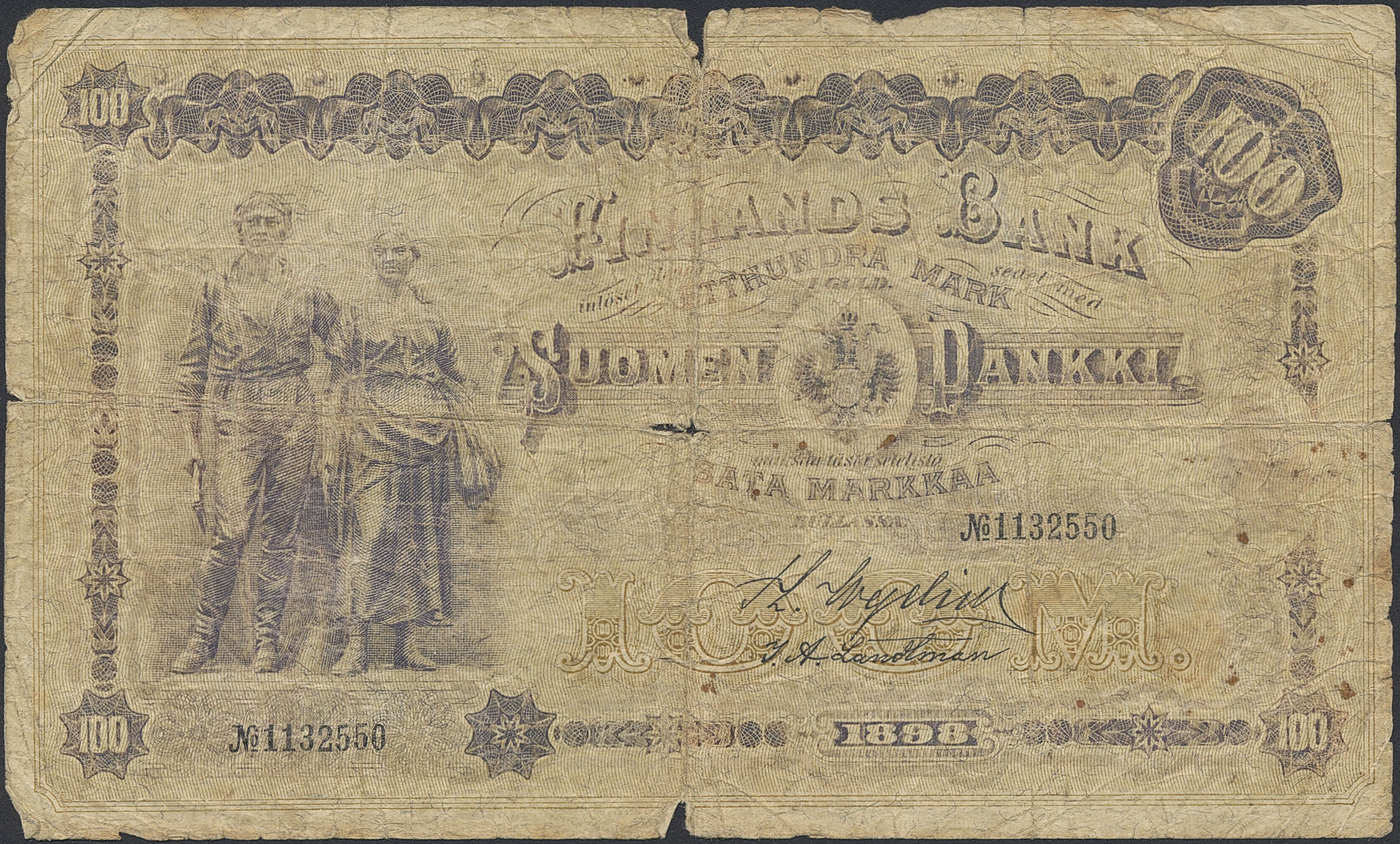 Banknotes, Finland. Pick 7c, 100 markkaa 1898. No: 1132550. 2.