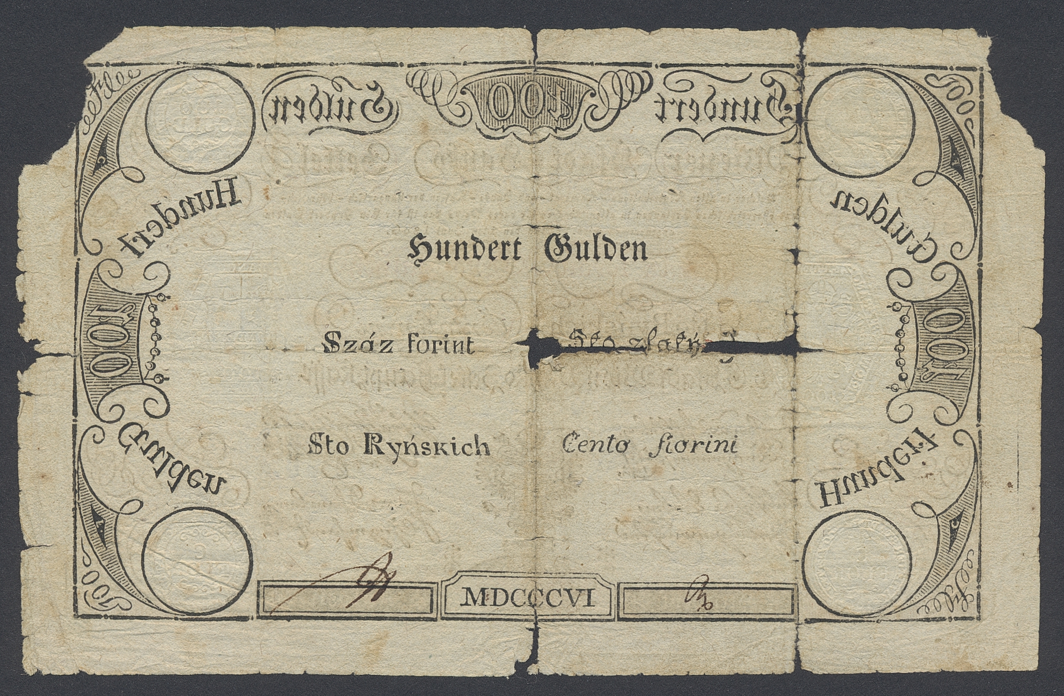 Banknotes, Austria. Pick A42a, 100 gulden 1806. No 8714. Corners missing and several holes. Nevertheless a very rare early issue. G-VG.