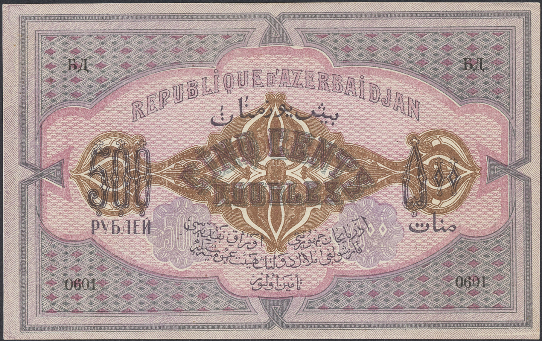 Banknotes, Azerbaijan. Pick 7, 500 roubles 1920. Crisp uncirculated note with minor handling marks. XF-UNC.