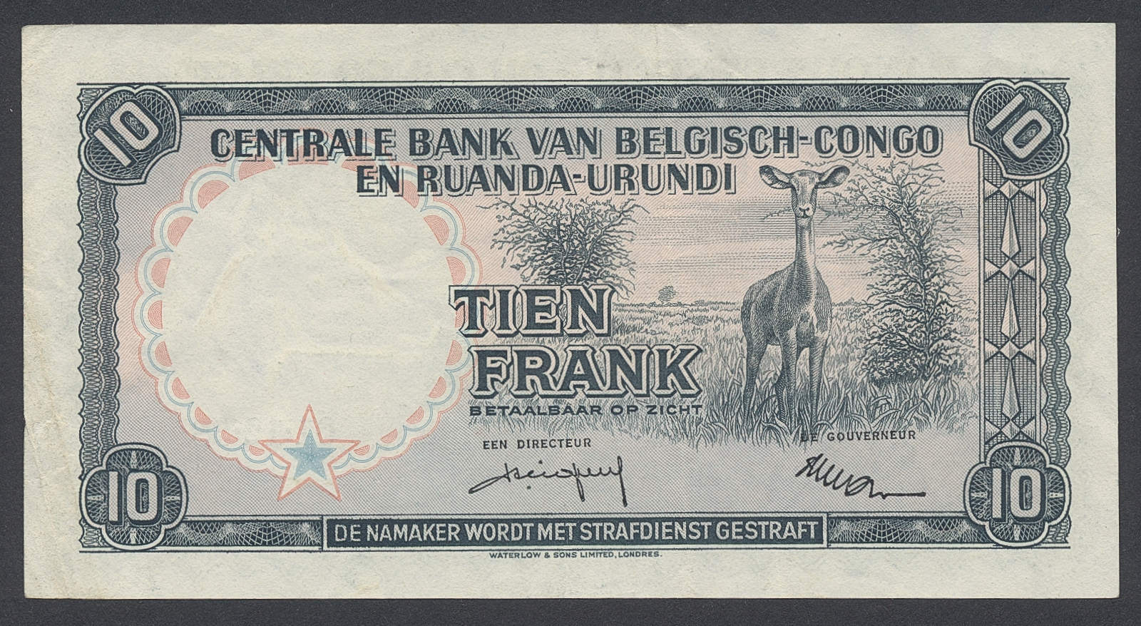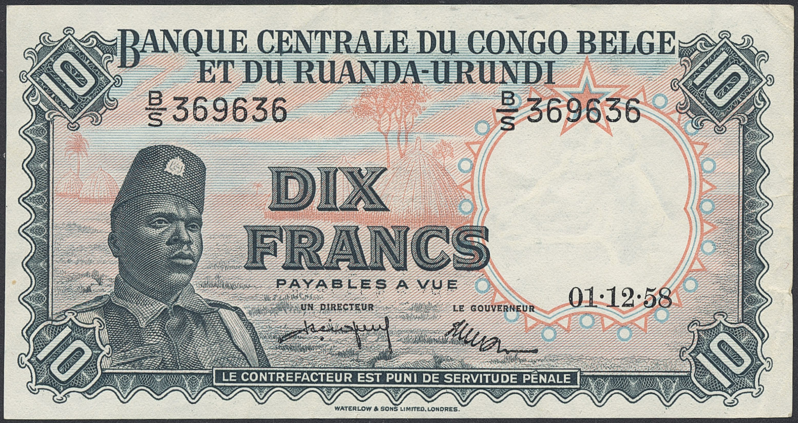 Banknotes, Belgian Congo. Pick 30b, 10 francs 01.12.58. B/S 369636. Fresh example. VF-XF.