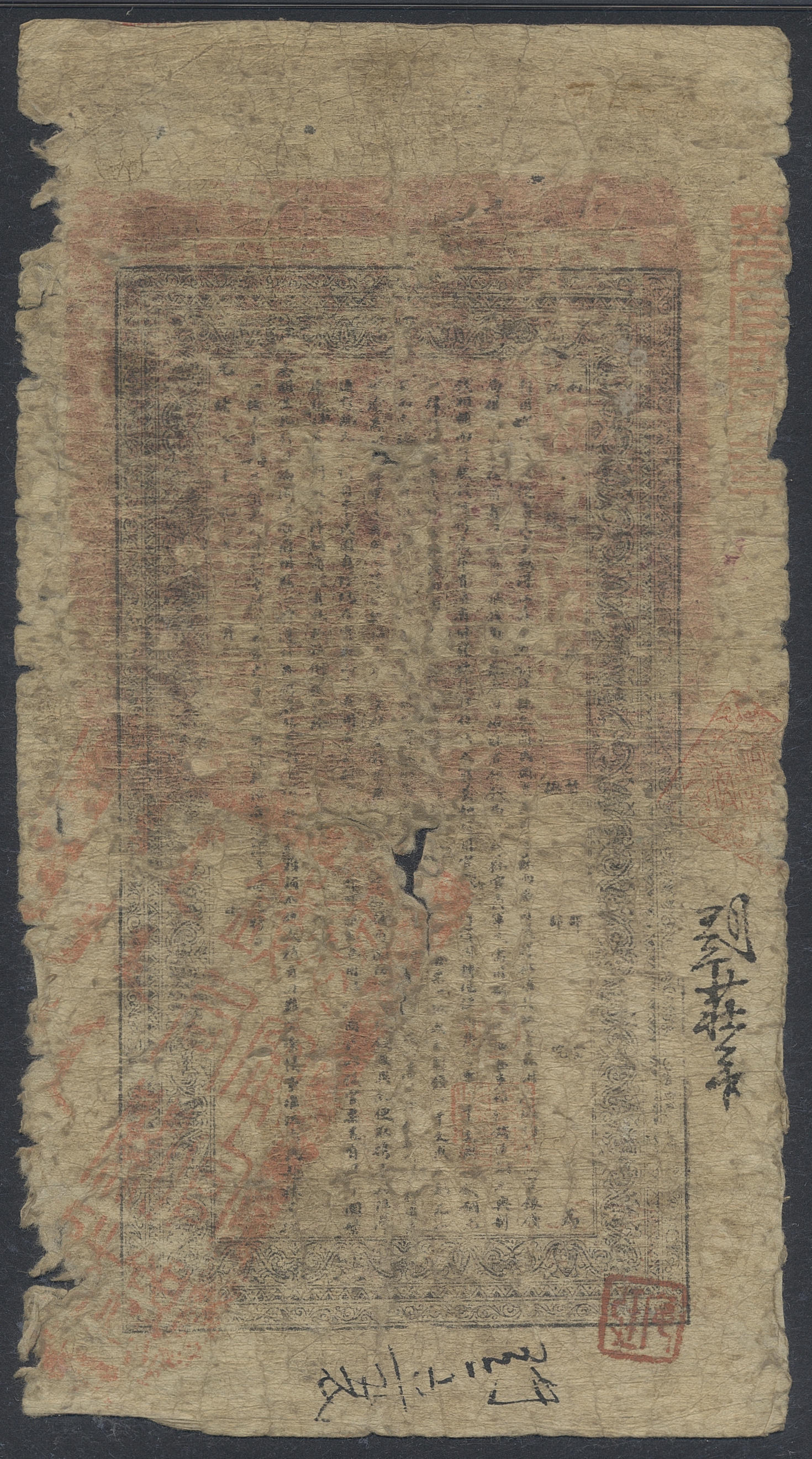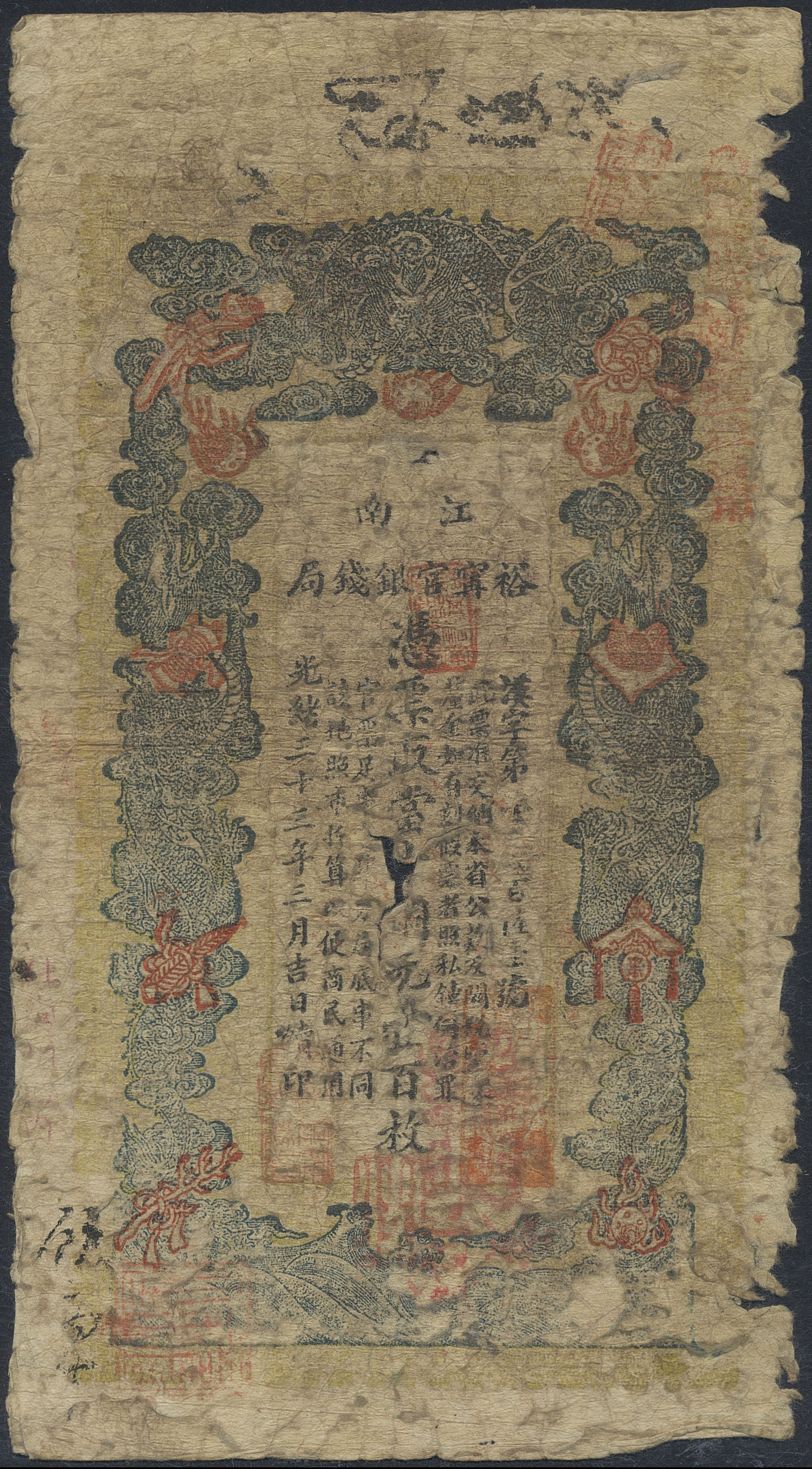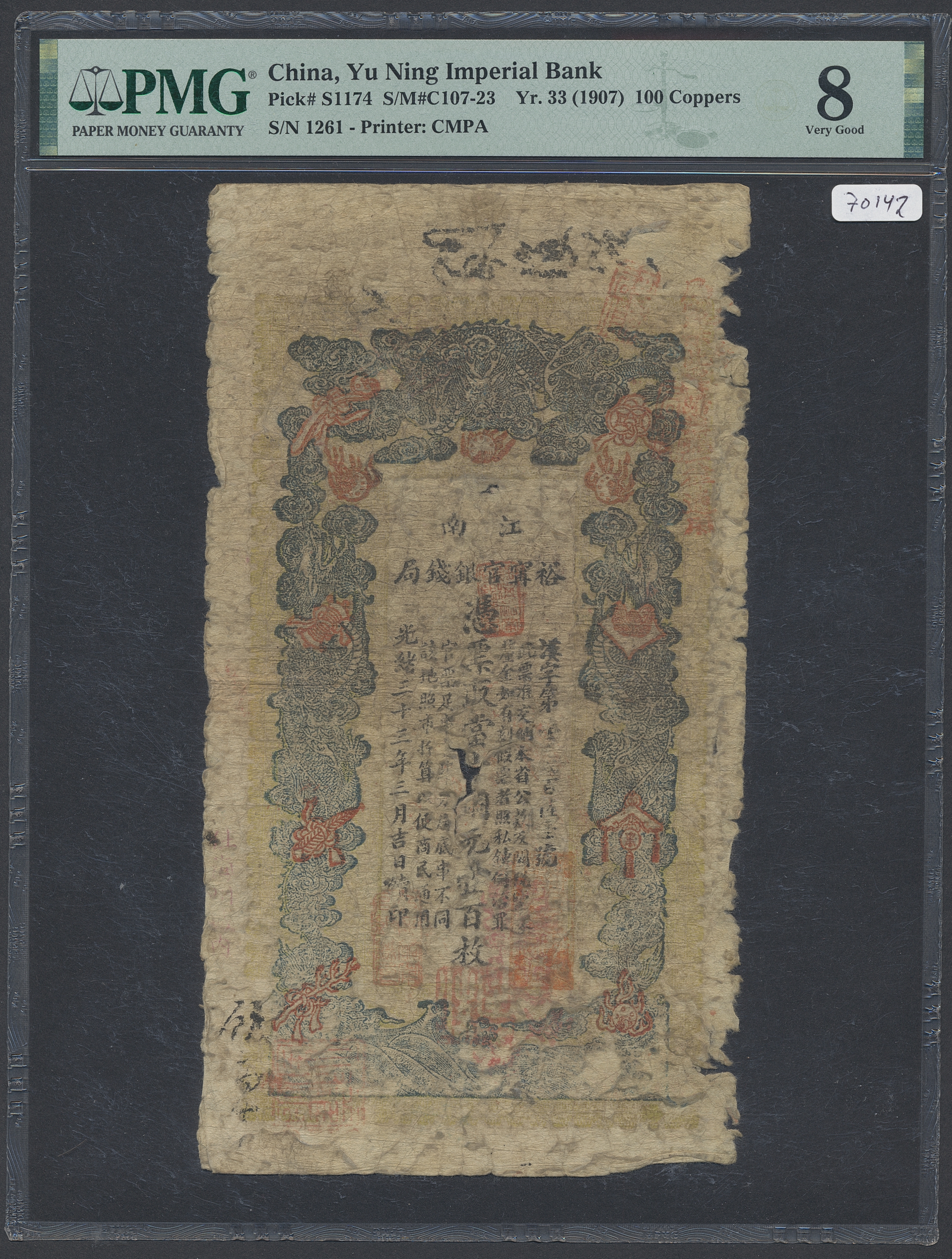 Banknotes, China - Empire. Pick S1174, 100 coppers Year 33 (1907). Scarce issue, minor ink writing and small paper loss. Graded by PMG as VG 8. VG.