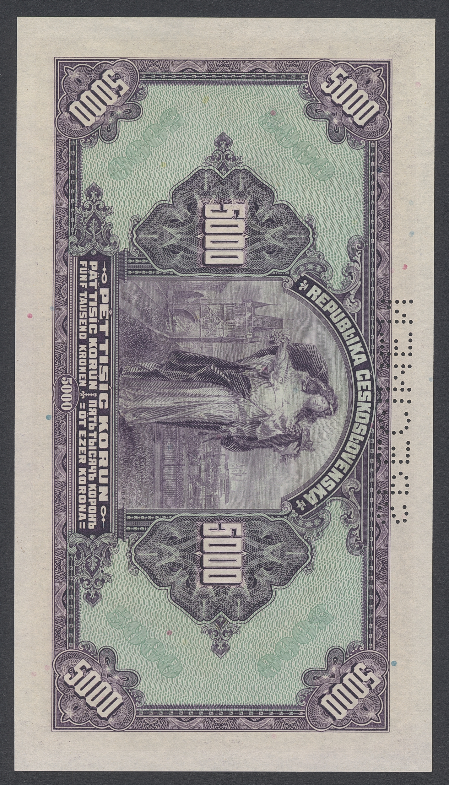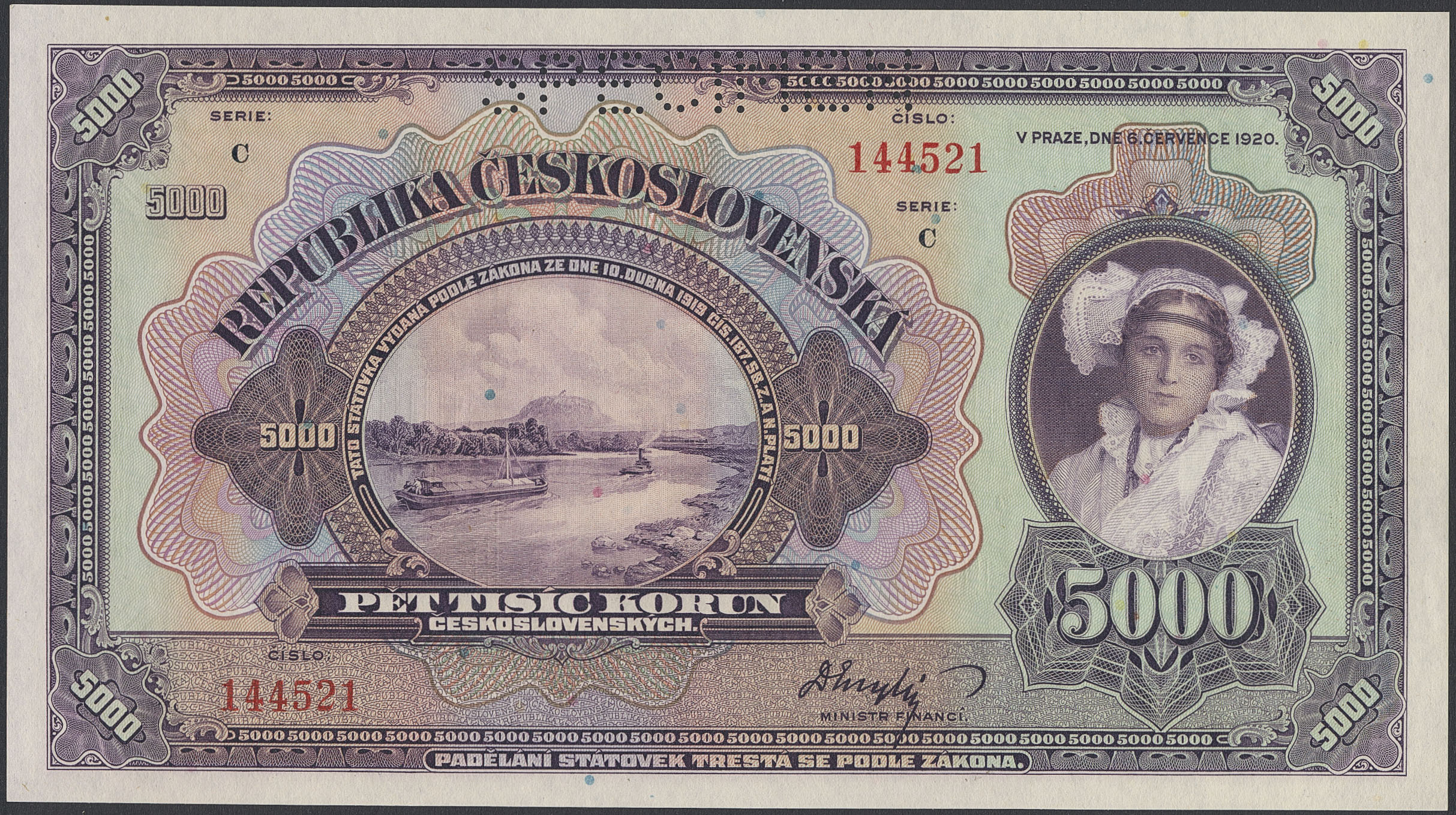 Banknotes, Czechoslovakia. Pick 19s, 5000 korún 1920. Punch cancelled SPECIMEN. UNC.