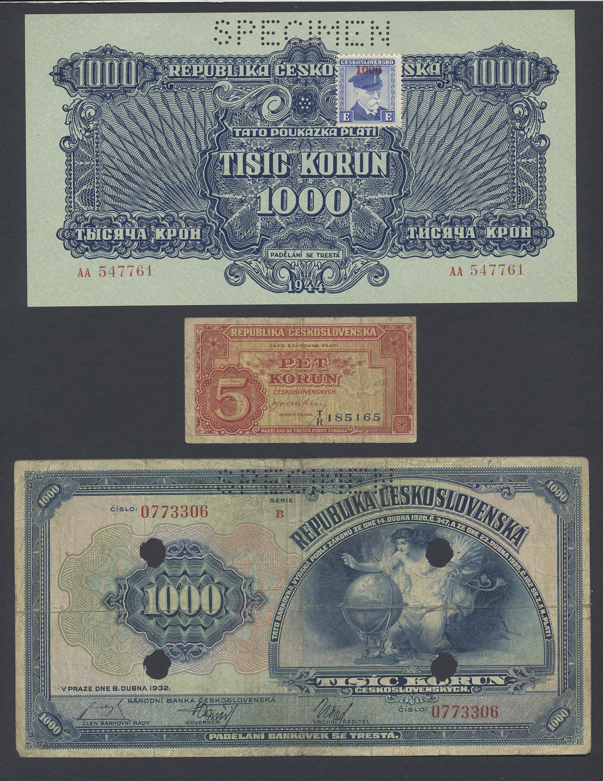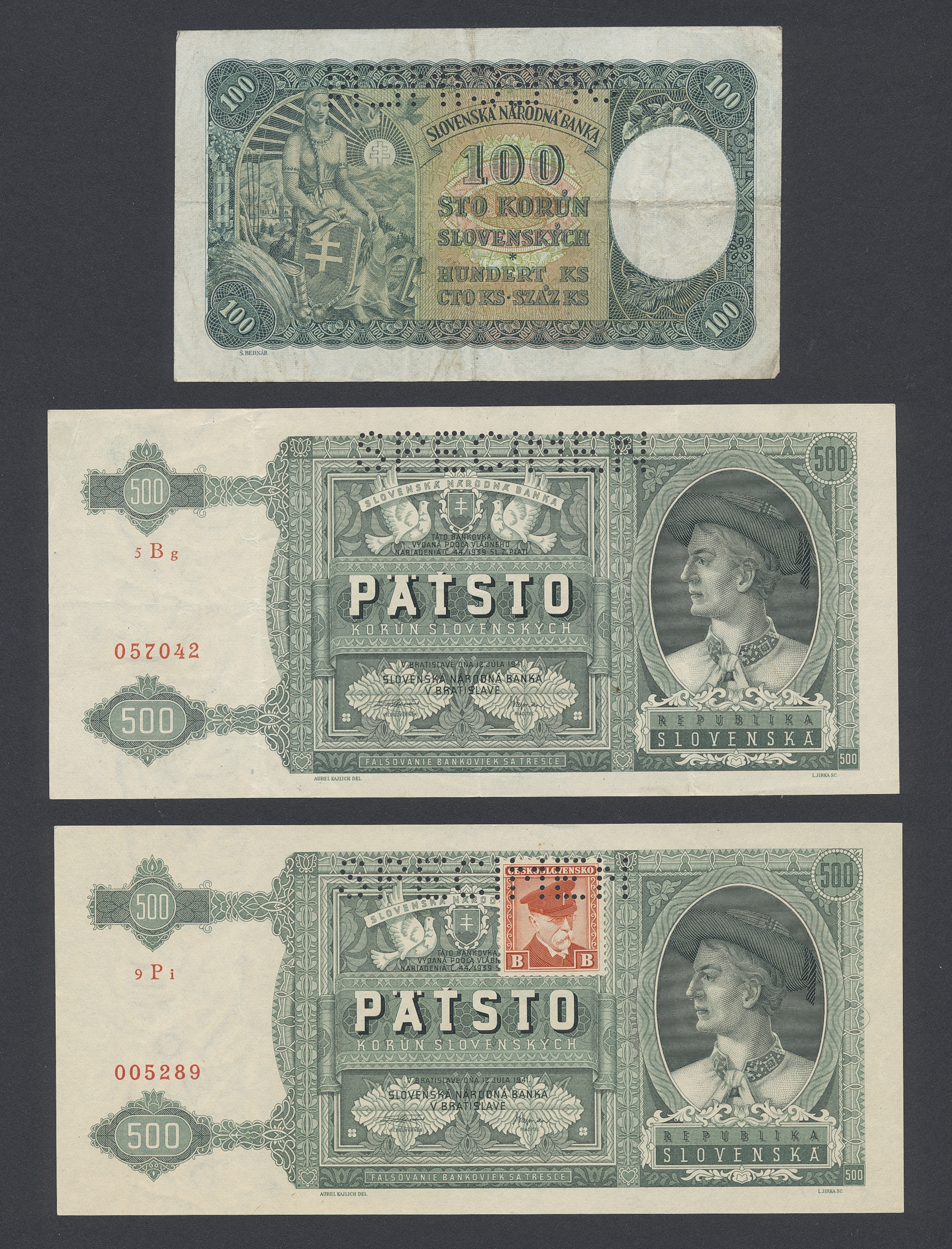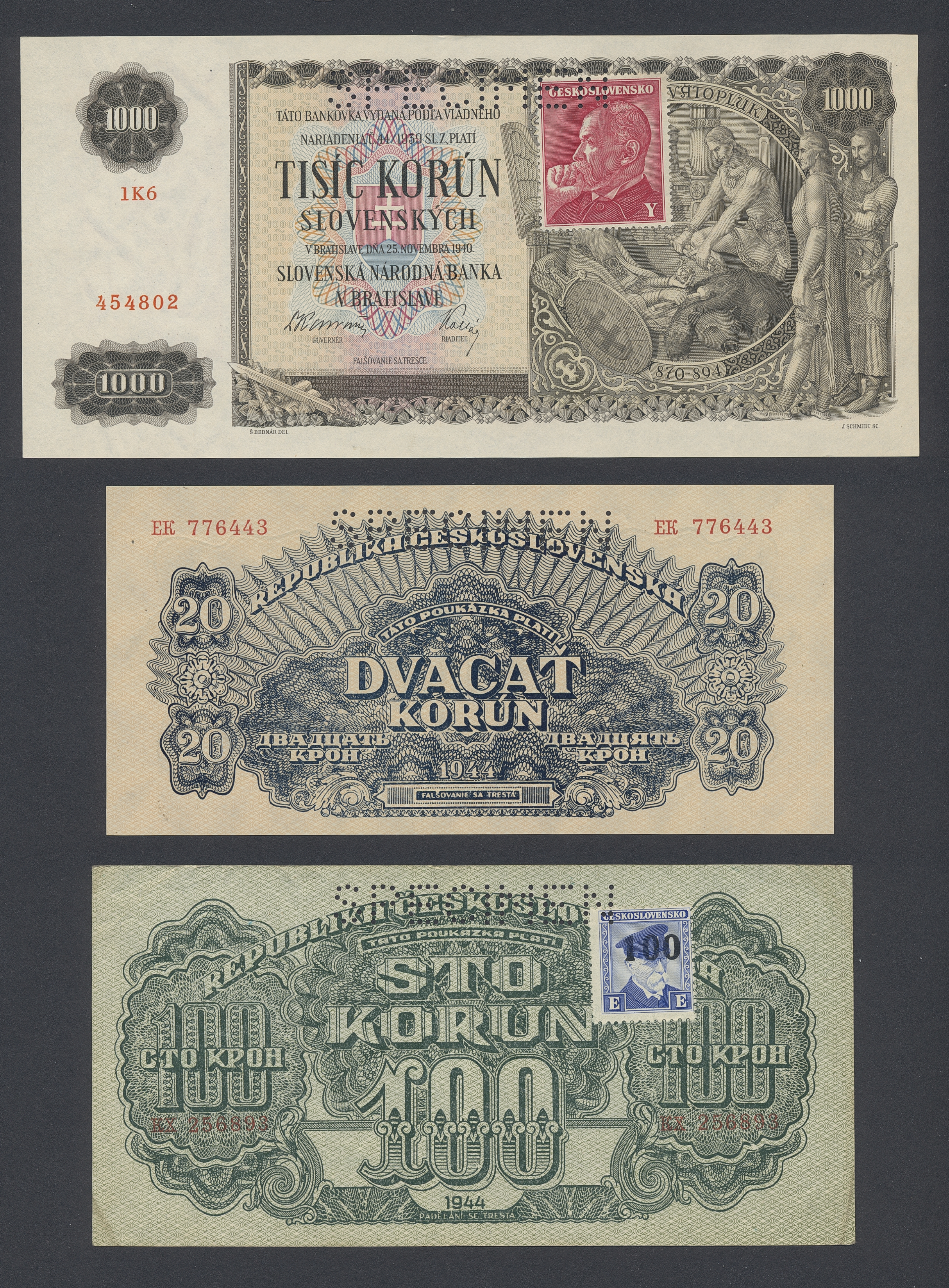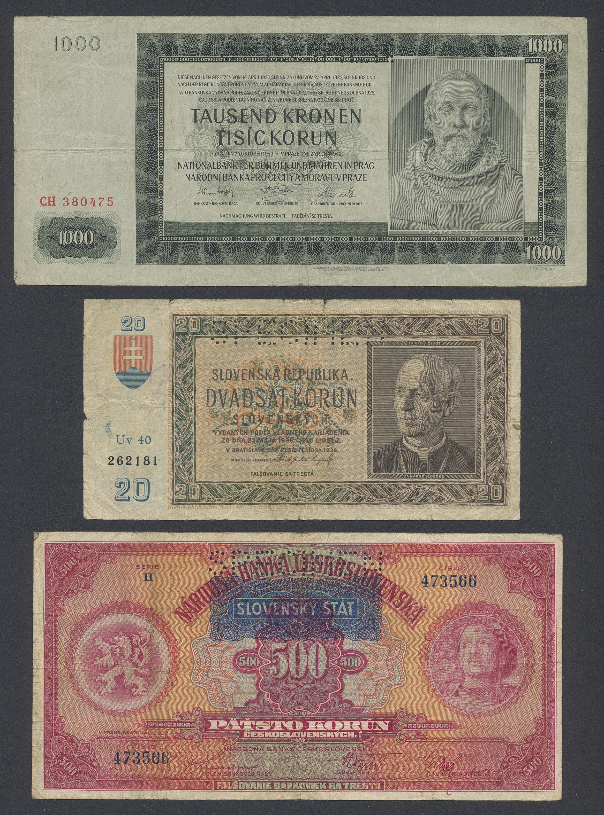 Banknotes, Czechoslovakia. Small collection of Czechslovakia, Slovakia and Bohemia and Moravia banknotes. All punch cancelled SPECIMEN, in total items. Includes Pick 53-56s uncirculated. Please inspect! F-UNC.