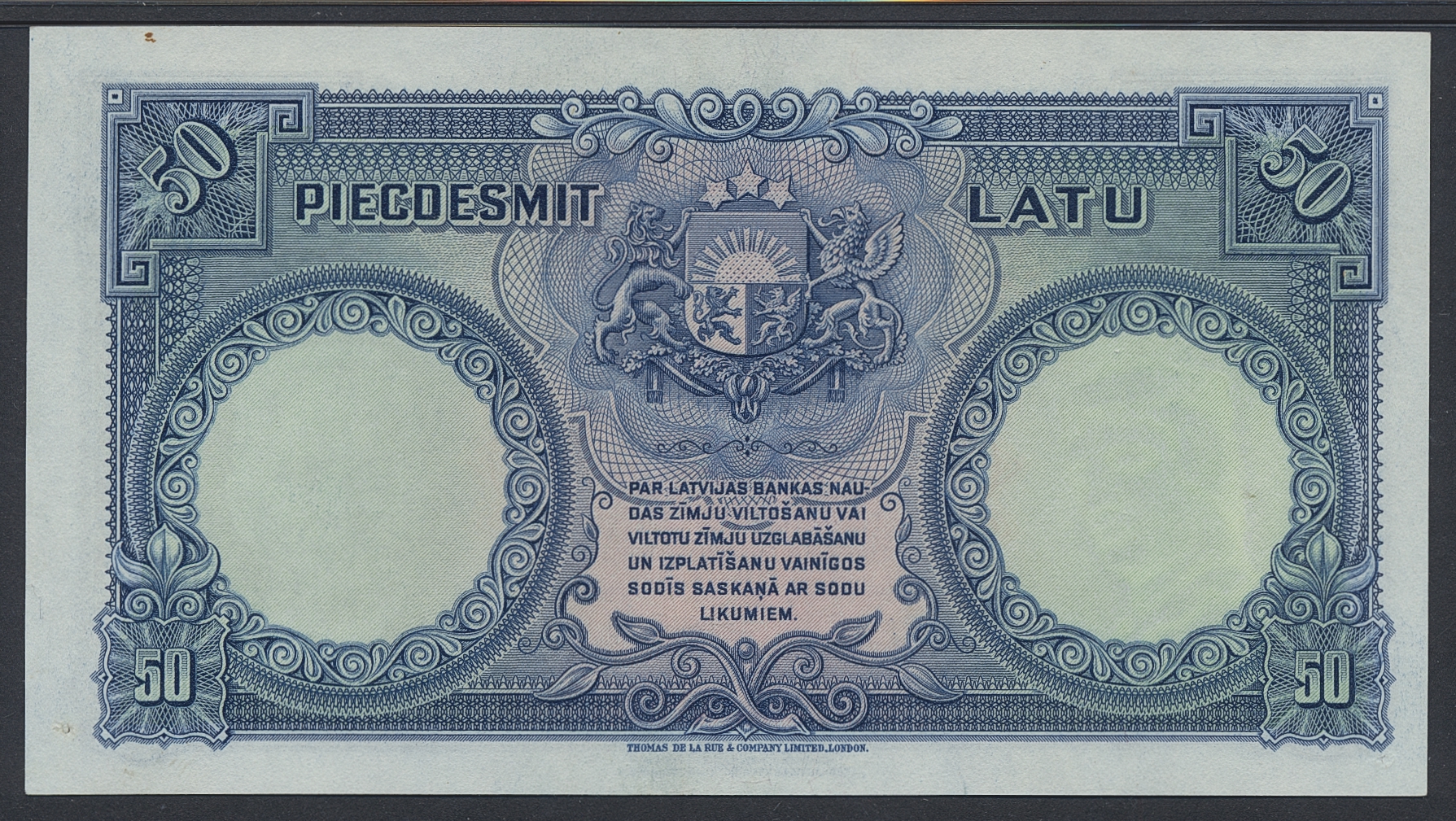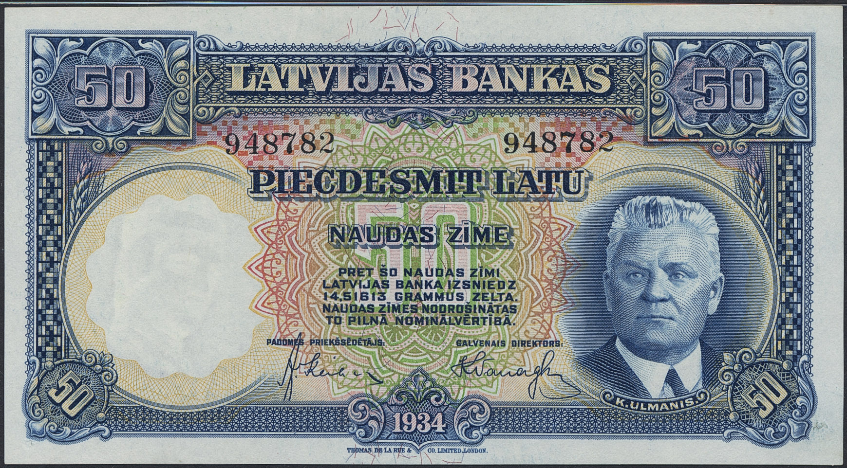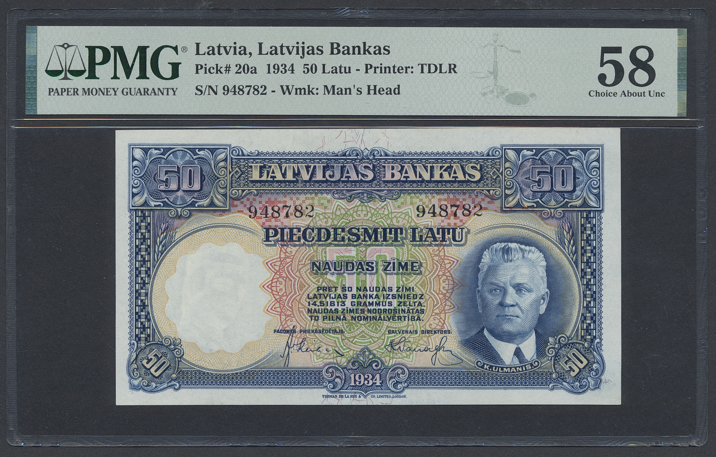 Banknotes, Latvia. Pick 20a, 50 latu 1934. 948782. Graded by PMG as AU58, comment 'minor rust'. XF-UNC.