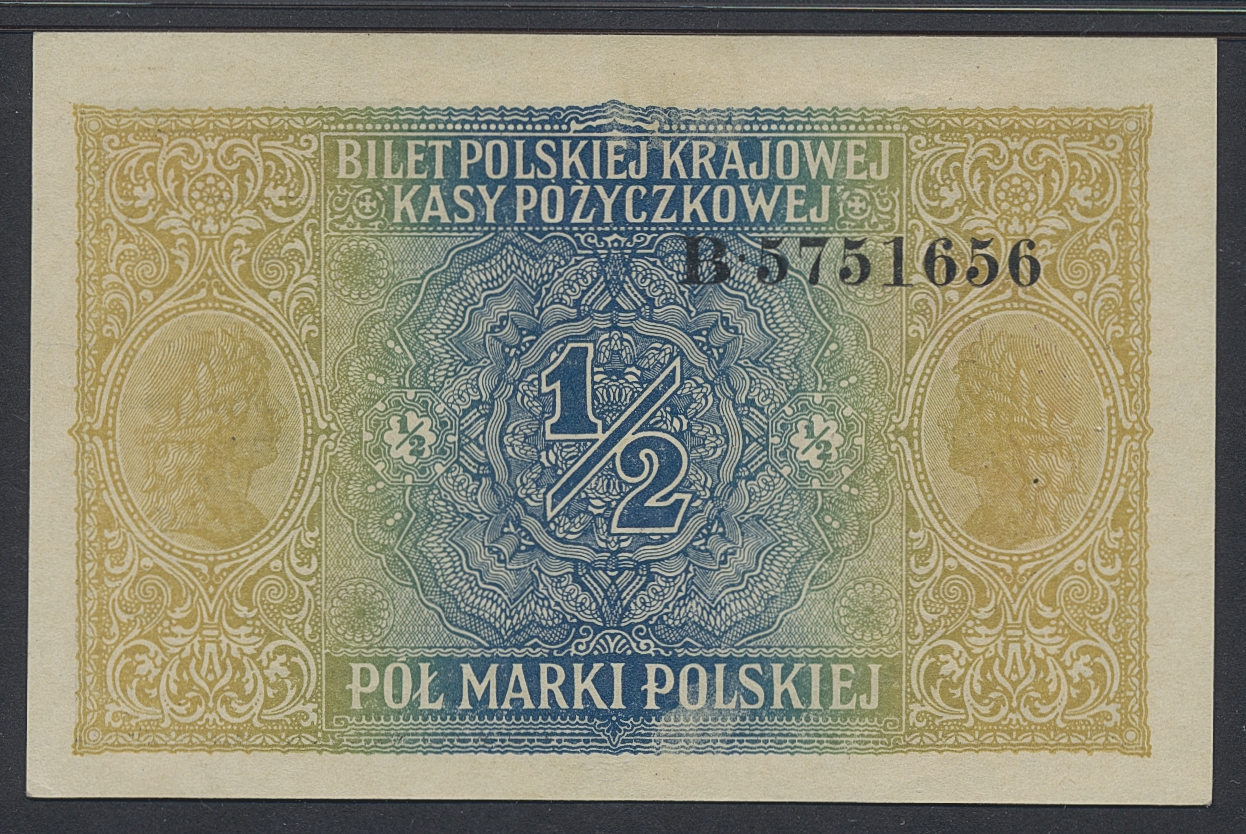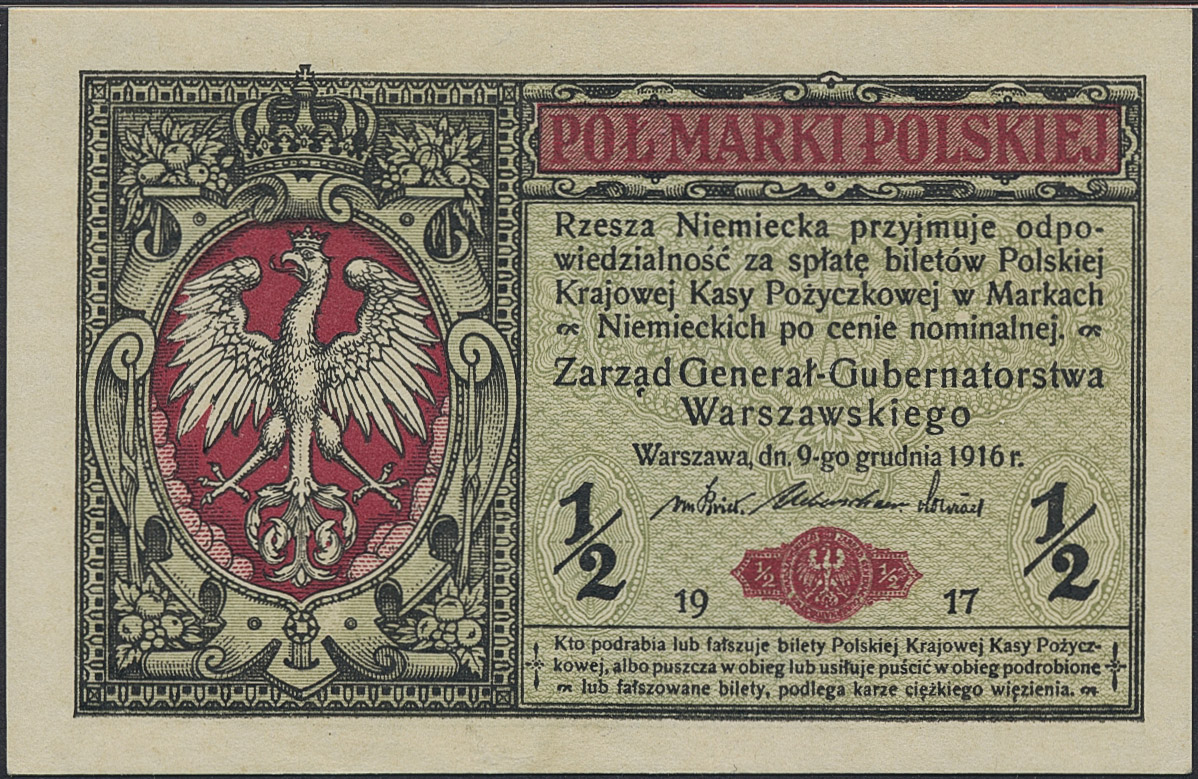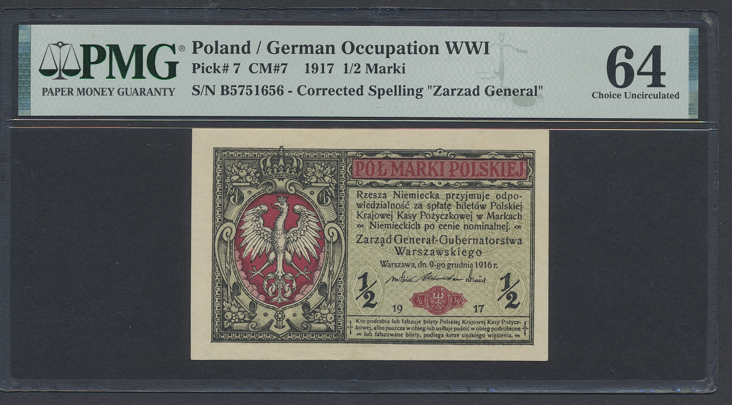 Banknotes, Poland. Pick 7, 1/2 marki 1917. Graded by PMG as uncirculated 64. UNC.
