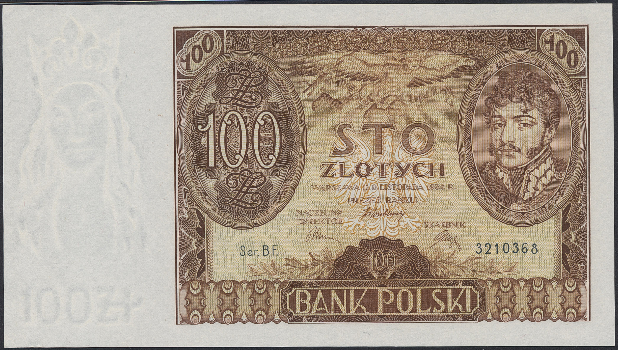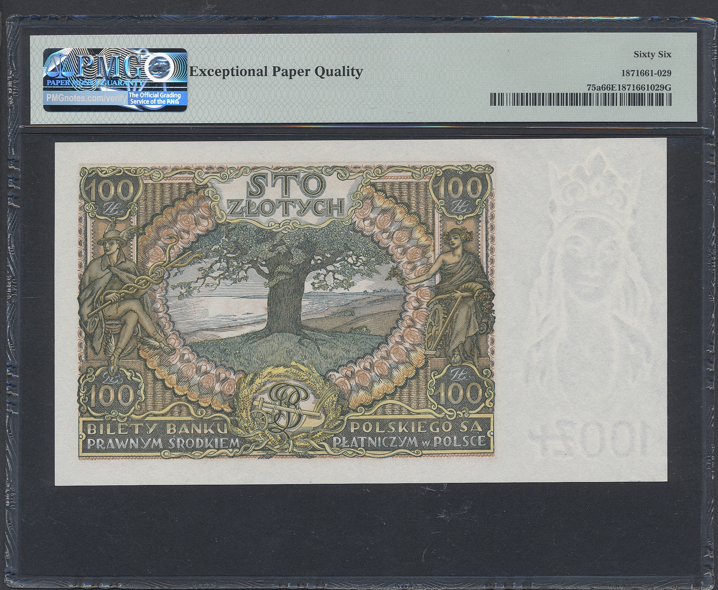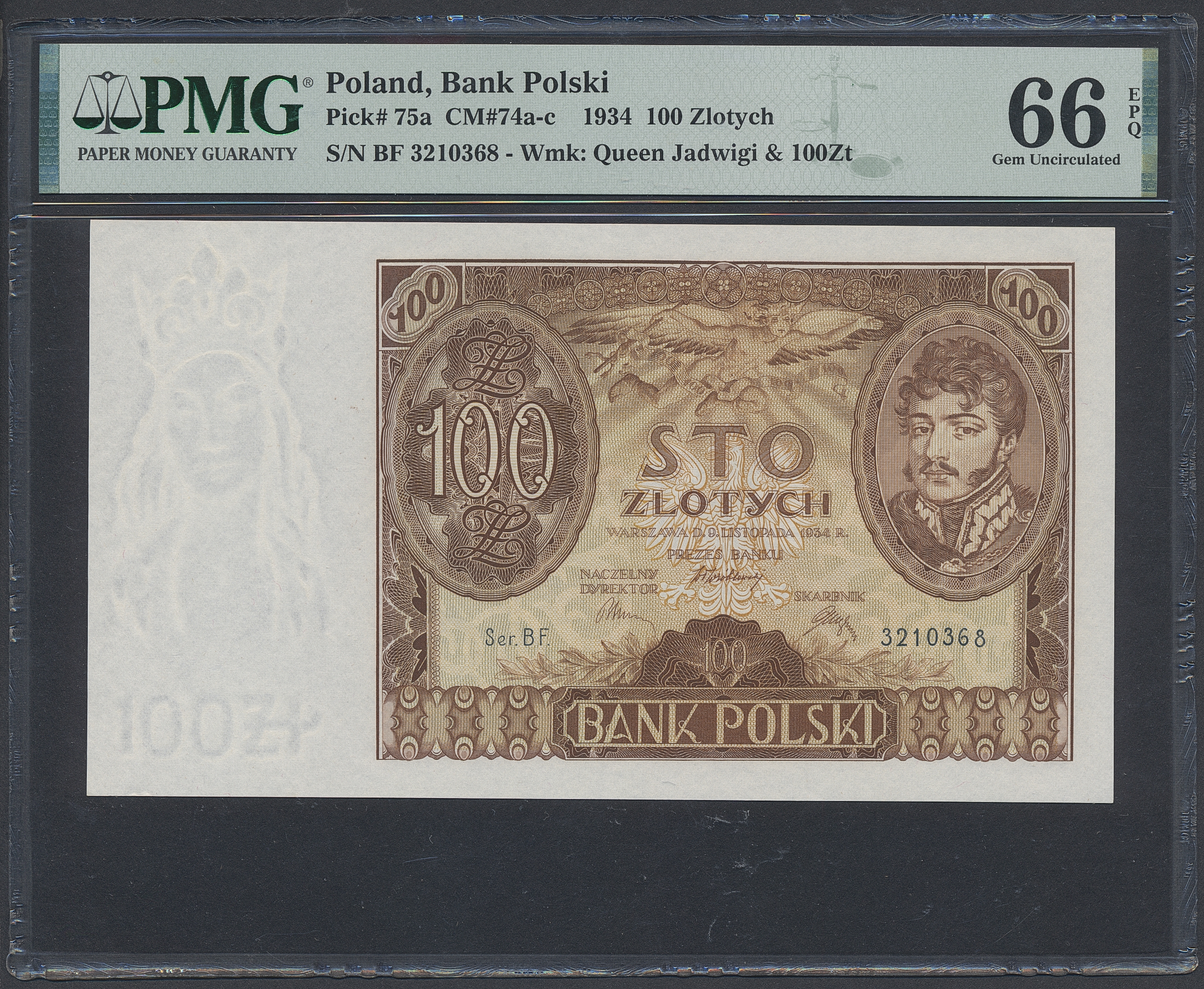 Banknotes, Poland. Pick 75a, 100 zlotych 1934. BF 3210368. Graded by PMG as uncirculated 66 EPQ. UNC.