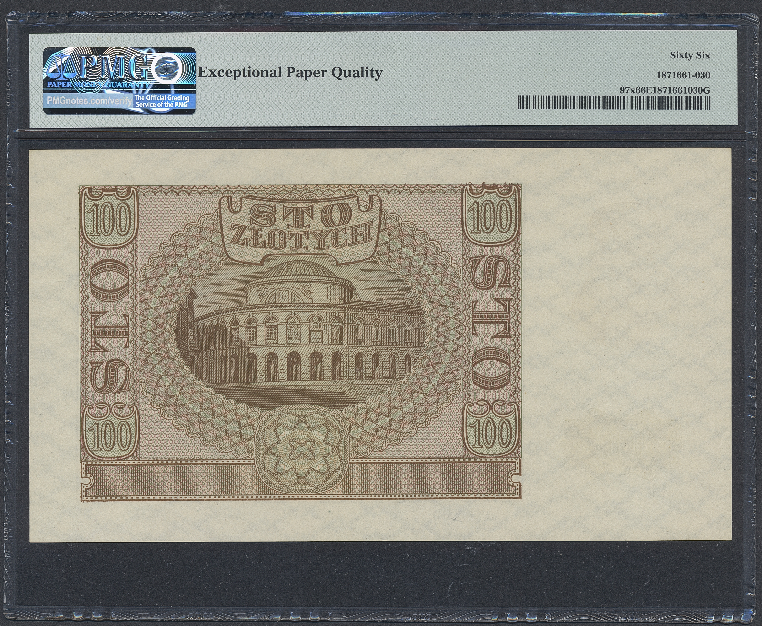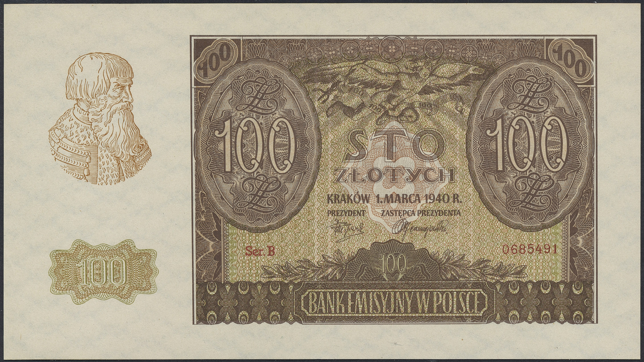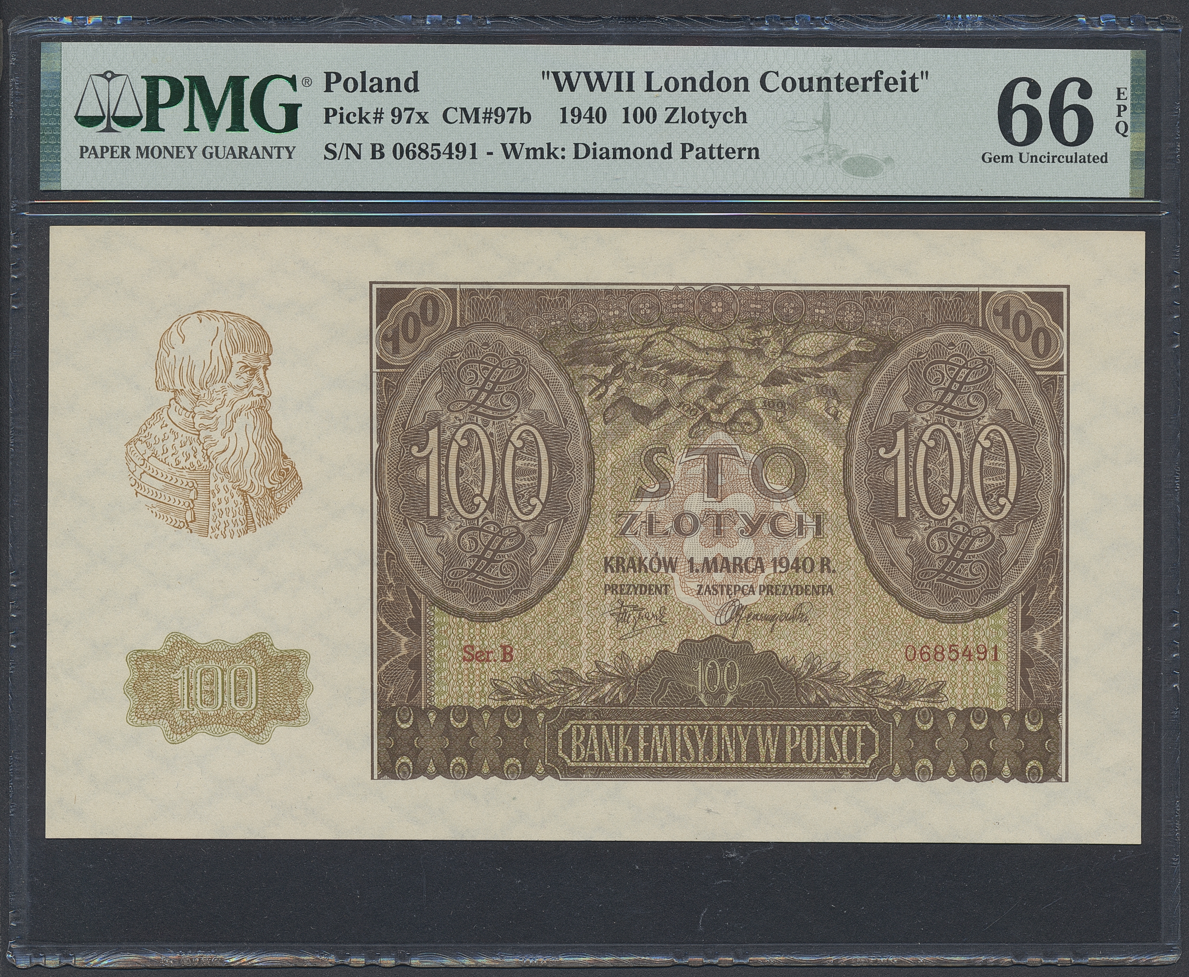 Banknotes, Poland. Pick 97x, 100 zlotych 1940. B 0685491. Contemporary forgery. Graded by PMG as uncirculated 66 EPQ. UNC.