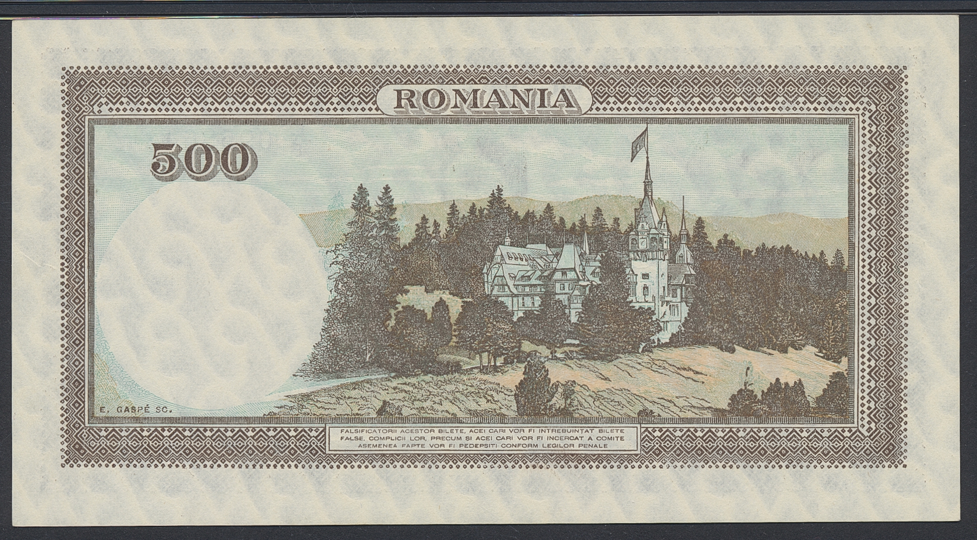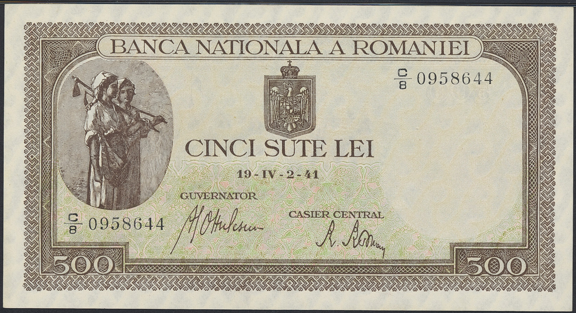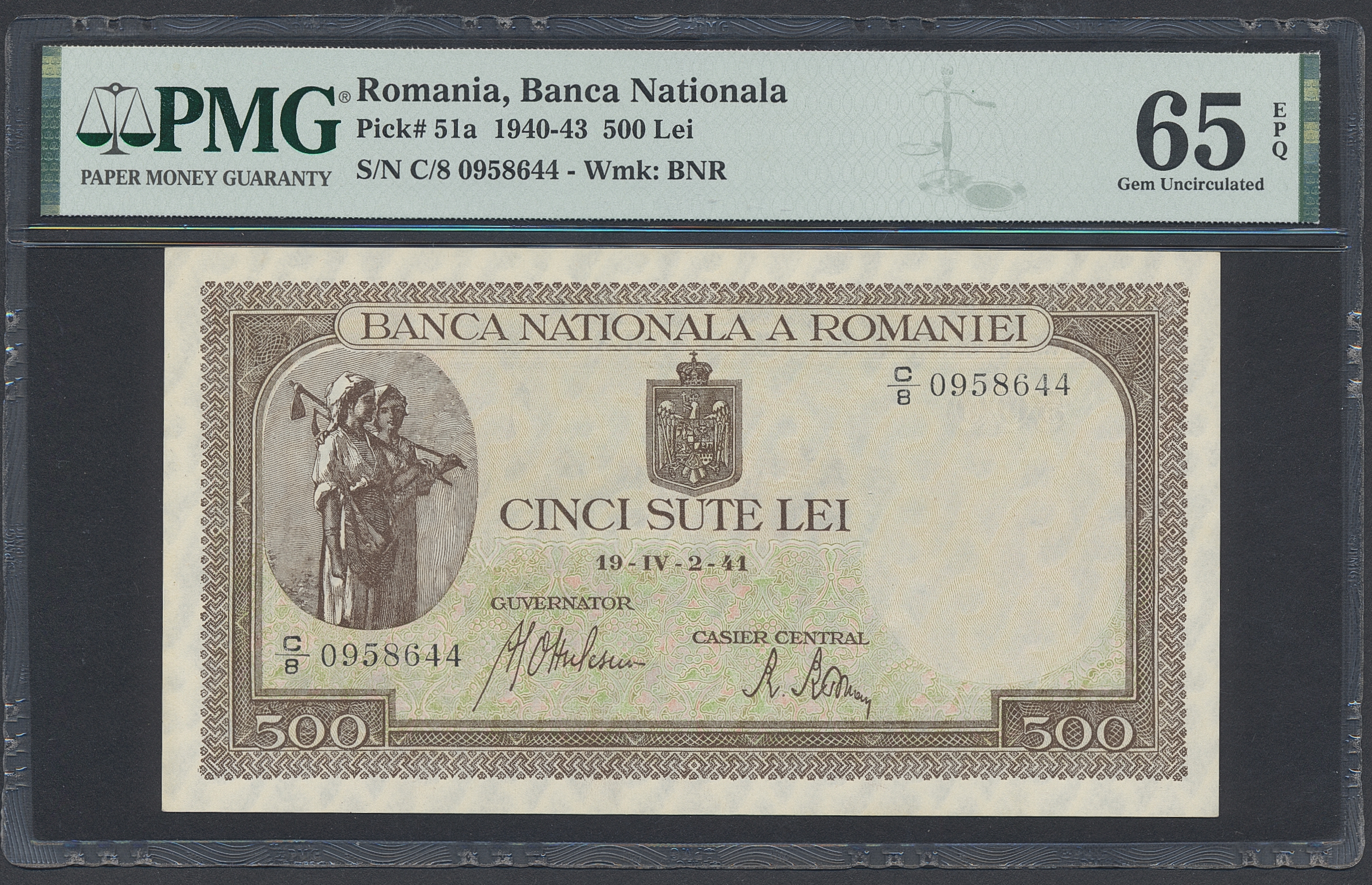 Banknotes, Romania. Pick 51a, 500 lei IV.2.1941. Graded by PMG as uncirculated 65 EPQ. UNC.