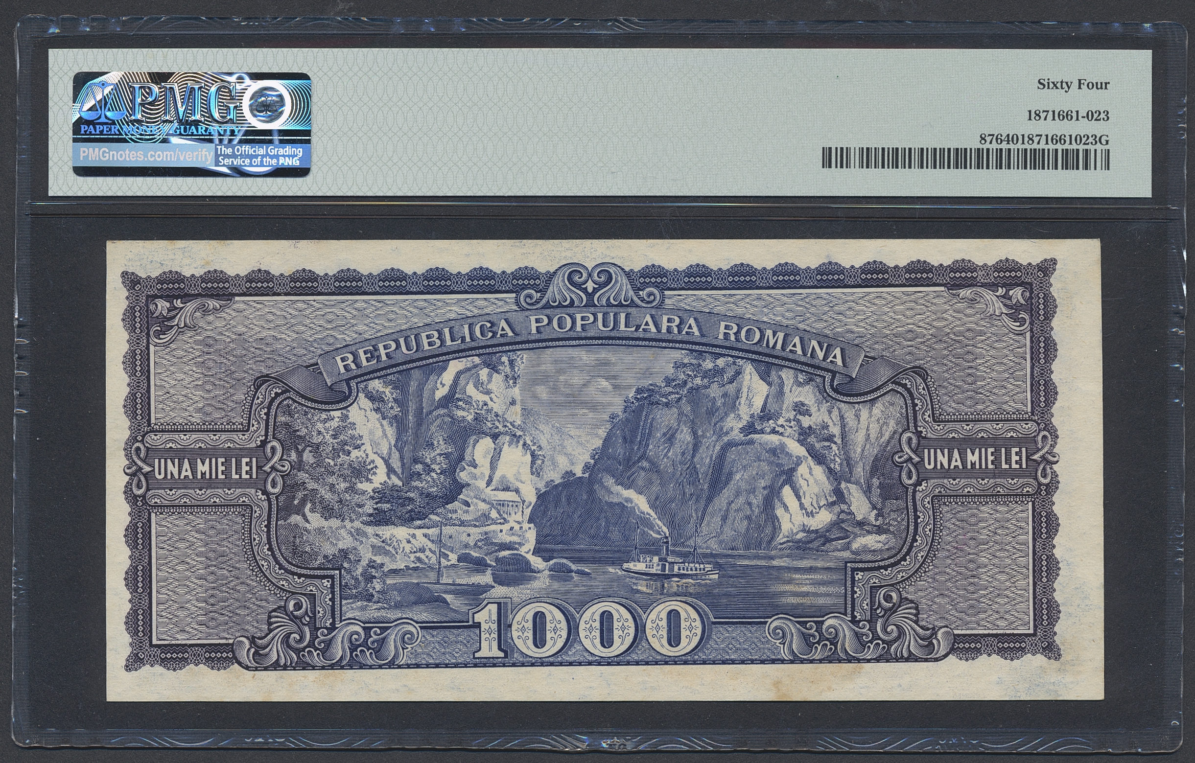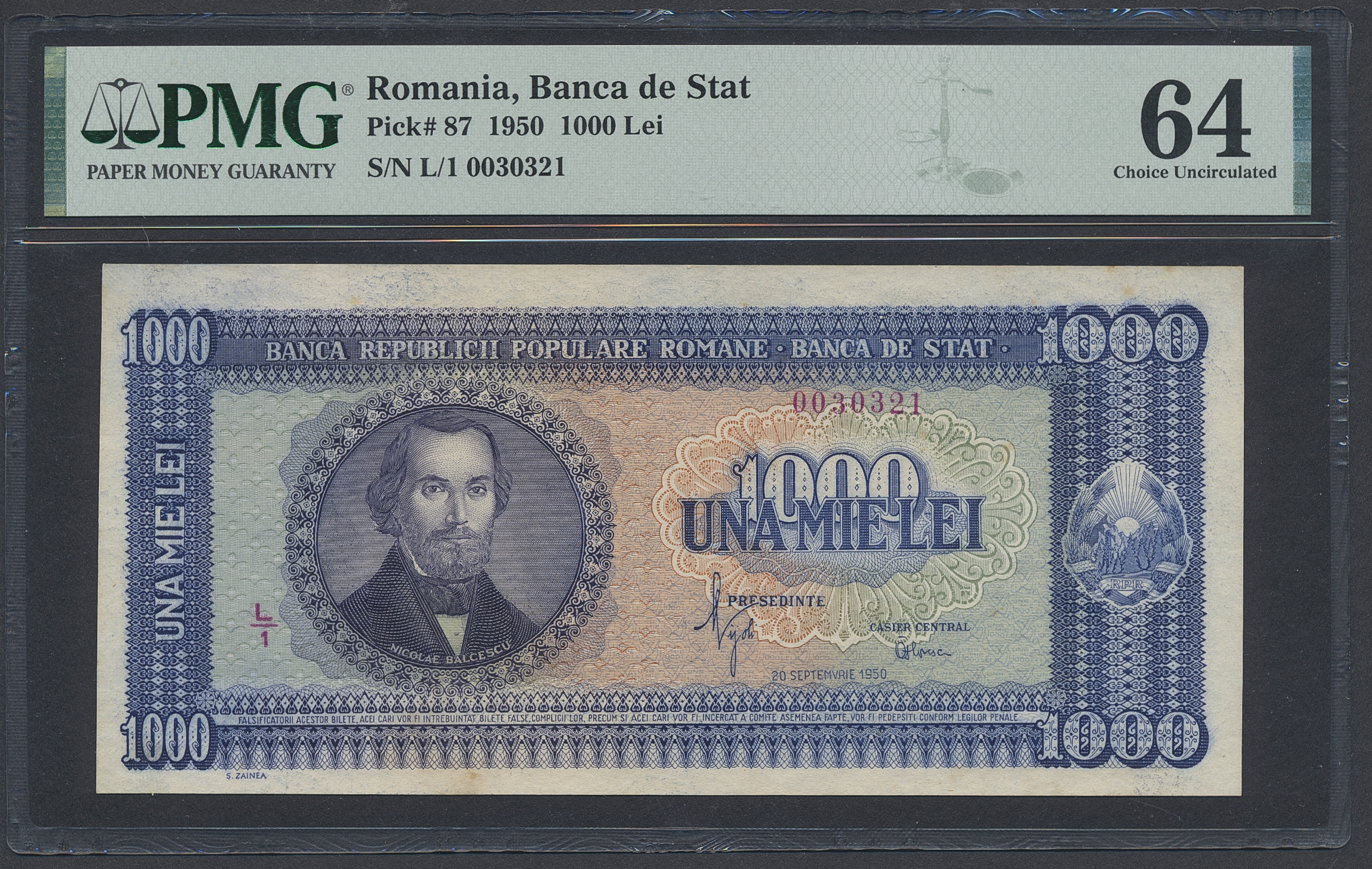 Banknotes, Romania. Pick 87, 1000 lei 1950. L/1 0030321. Graded by PMG as uncirculated 64. UNC.