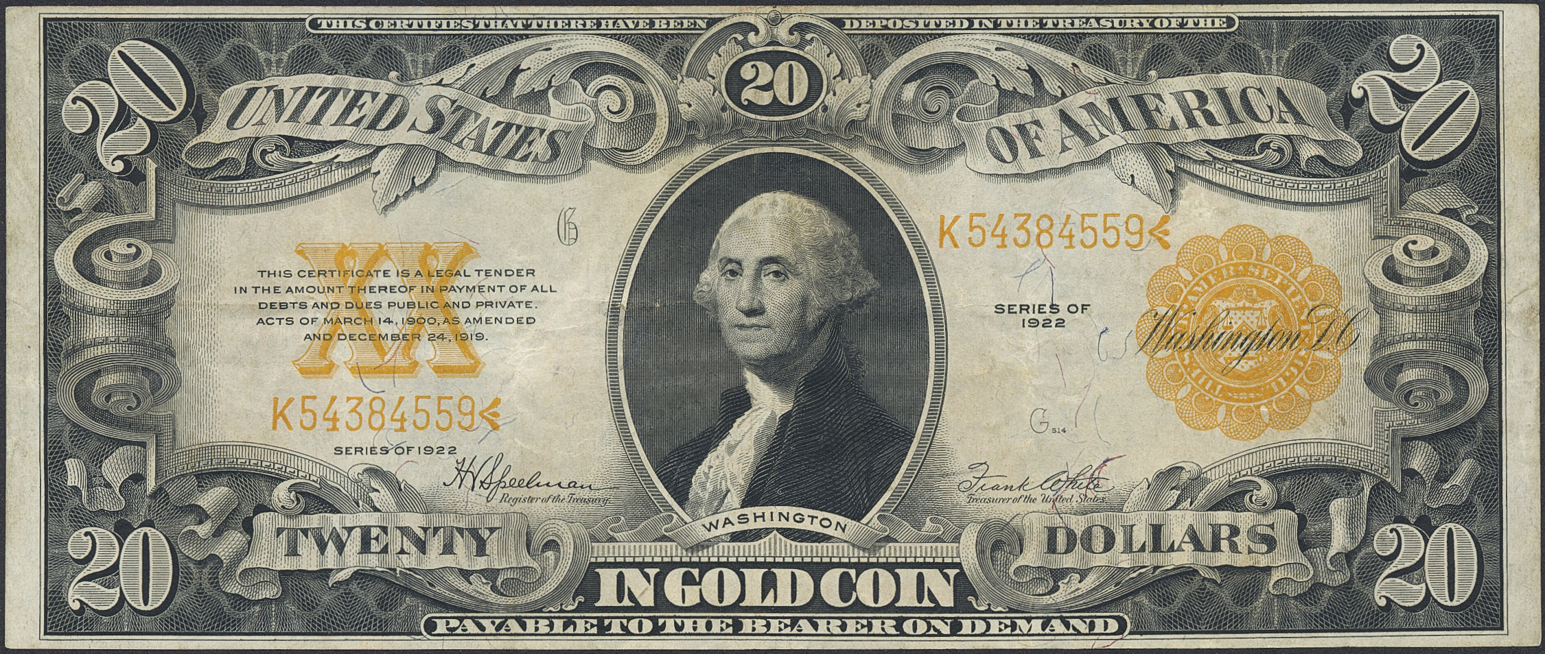 Banknotes, U.S.A. Pick 275, 20 dollars 1922. VF.