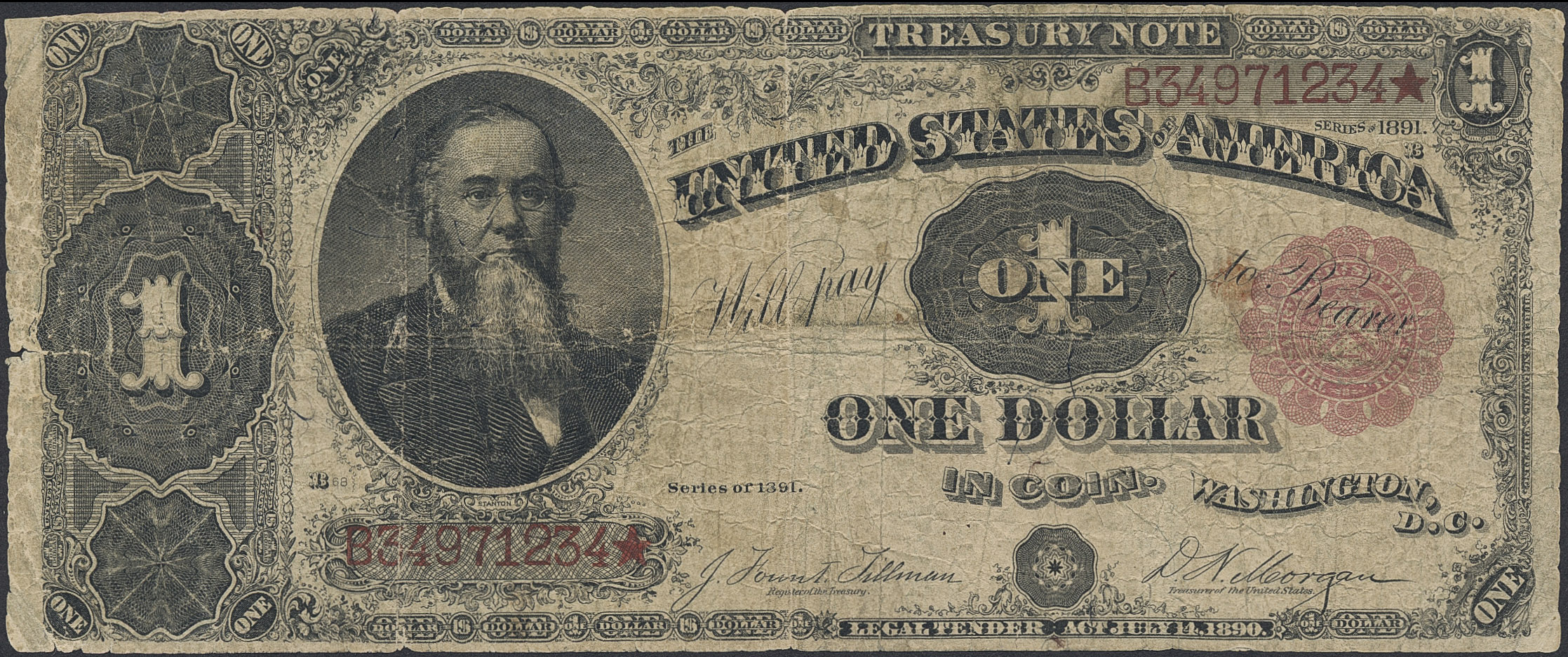 Banknotes, U.S.A. Pick 351, 1 dollar 1891. Tillman-Morgan signatures. Small tears. VG.