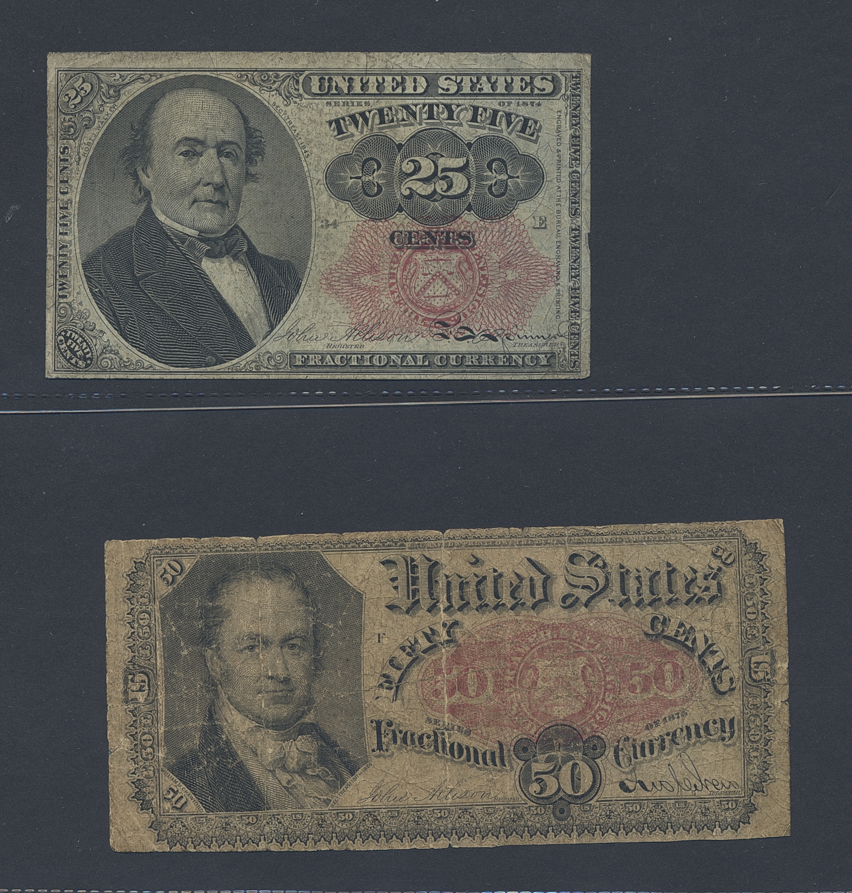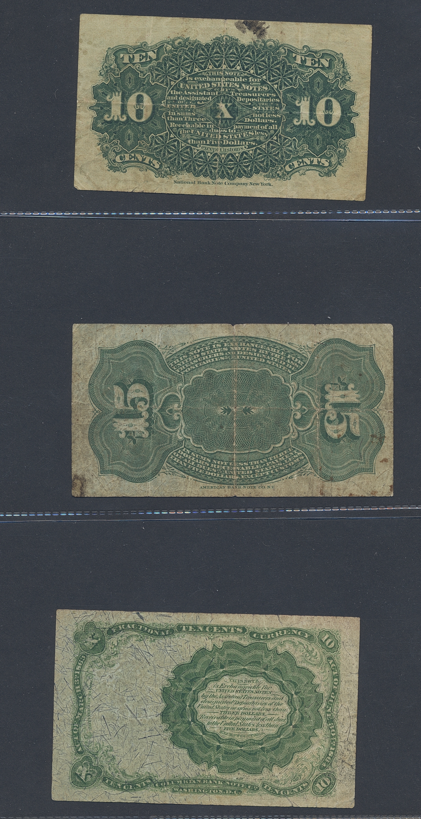 Banknotes, U.S.A. Small lot of five fractional notes including 10 cents 1874 (Pick 122a), 10 cents 1863 (Pick 115a), 15 cents 1863 (Pick 116c), 25 cents 1874 (Pick 123), 50 cents 1874 (Pick 124). Please inspect! VG-XF.