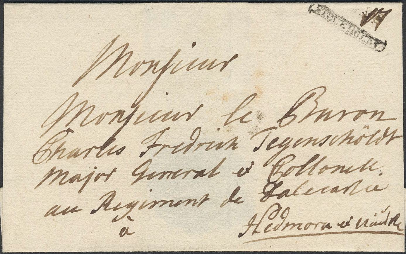 Sweden. A county. STOCKHOLM, ribbon postmark. Type 1 on cover dated '1724' by pen, sent to Hedemora. Superb. Postal: 2500:-