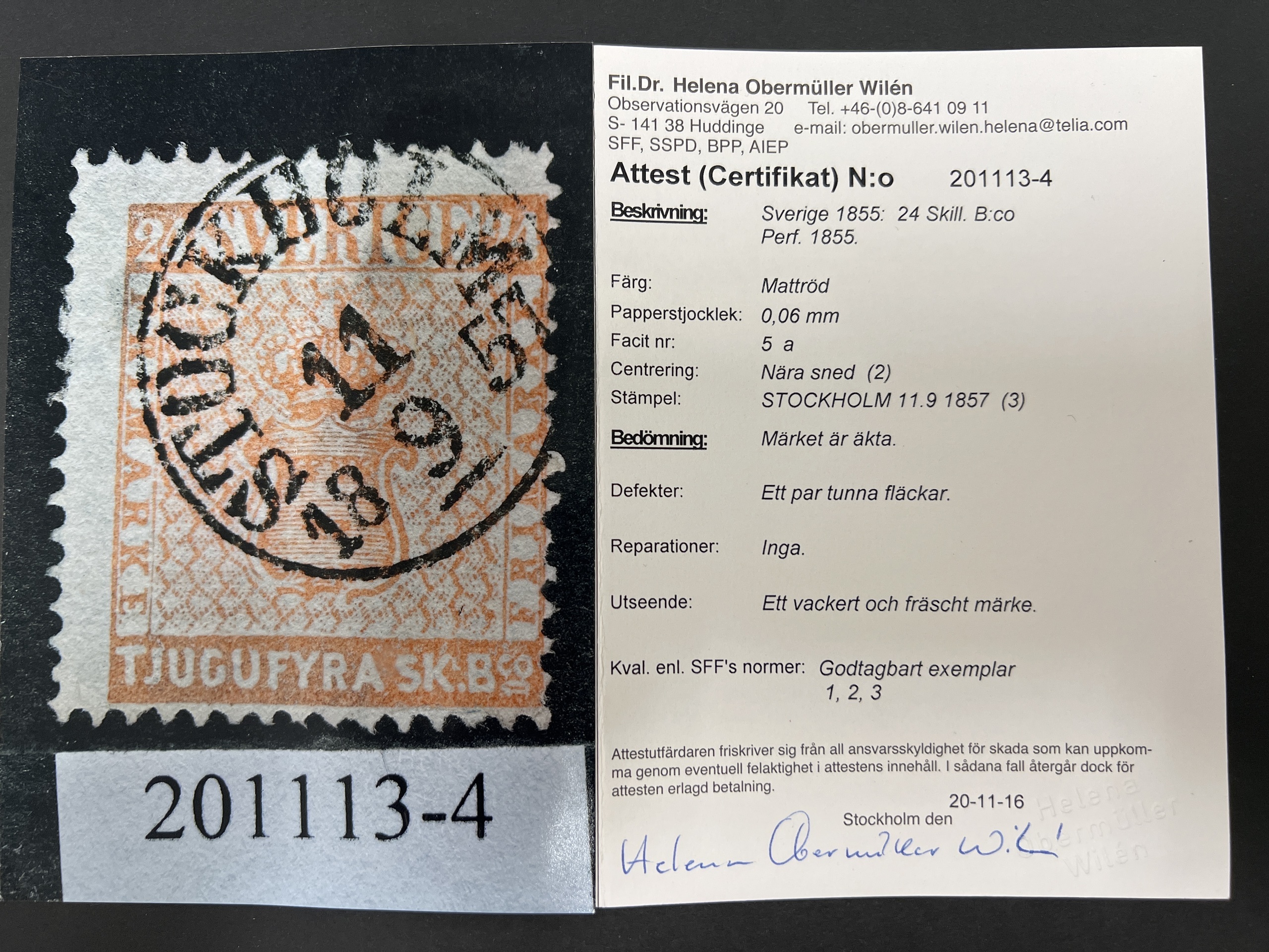 Sweden. Facit 5a used, 24 skill dull red, thin paper with certificate HOW 'Ett vackert och fräscht märke', 1, 2, 3, Genuine with a a couple of thin spots. No repairs. SEK 18000