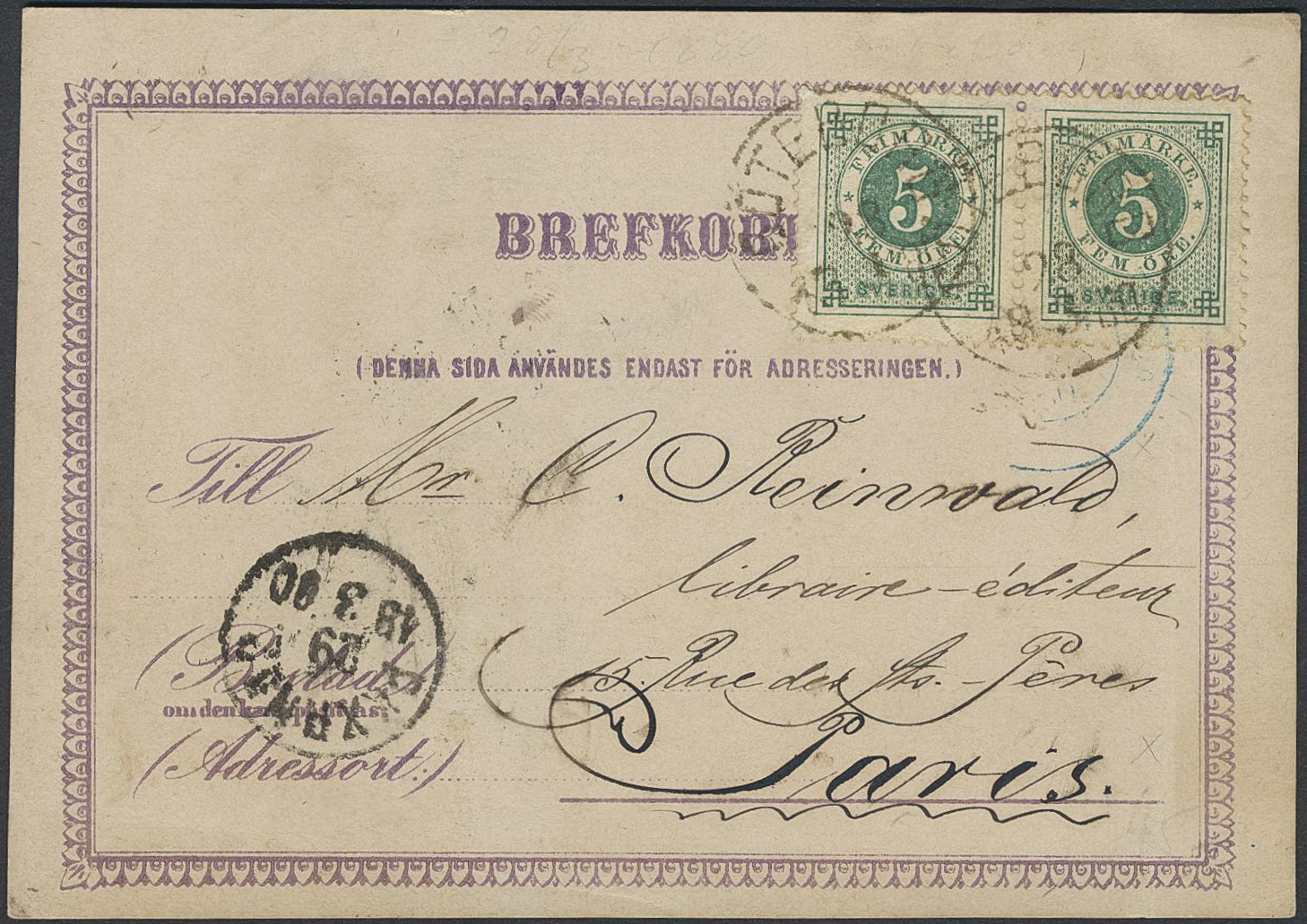 Sweden. Facit 30 on cover, 2×5 öre on early postcard sent from GÖTEBORG 28.3.1880 to France. Weak crease. Privately manufactured postcards were not allowed abroad until 1.4.1886. Scarce item.