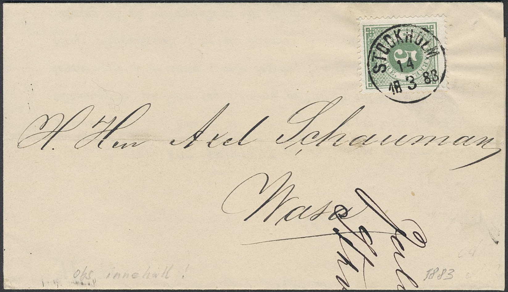 Sweden. Facit 30 on cover, 5 öre on beautiful printed matter sent from STOCKHOLM 14.3.1883, via Russia with transit pmk on the reverse, to Finland.