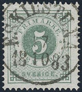 Sweden. Facit 30f used, 5 öre greyish olive-green. EXCELLENT cancellation ESKILSTUNA 17.10.1883.