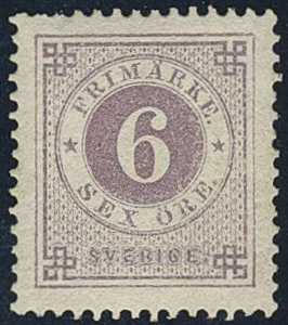 Sweden. Facit 31 ★★, 6 öre violet. Perfect centering. Short perfs. SEK 4000