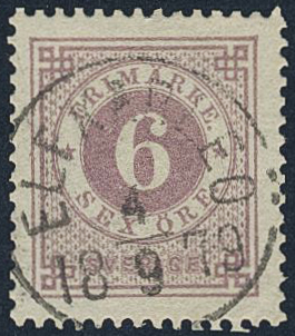 Sweden. Facit 31b used, 6 öre reddish lilac. Superb–EXCELLENT cancellation ELFKARLEÖ 4.9.1879. Signed by O.P.