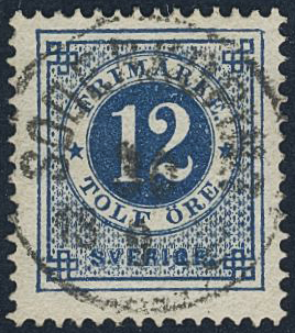 Sweden. Facit 32d used, 12 öre dark blue clean distinct print. EXCELLENT cancellation SÖDERKÖPING 10.9.1882. Better shade.