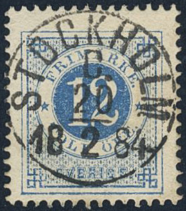 Sweden. Facit 32h used, 12 öre dark blue - light blue on calendered paper. EXCELLENT cancellation STOCKHOLM C 20.2.1884.