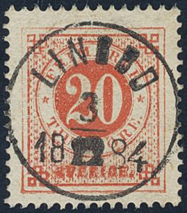 Sweden. Facit 33f used, 20 öre orange-red on calendered paper. EXCELLENT cancellation LINGBO 3.12.1884.