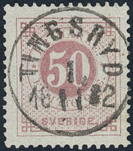 Sweden. Facit 36e used, 50 öre rose. EXCELLENT cancellation TINGSRYD 1.11.1882. Signed by O.P.