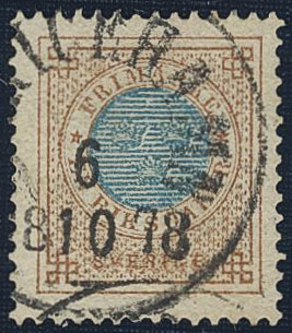 Sweden. Facit 37 used, 1 Riksdaler brown/blue. Beautiful example cancelled ULRICEHAMN 6.10.1878, with small part of a second mark. SEK 4000