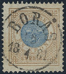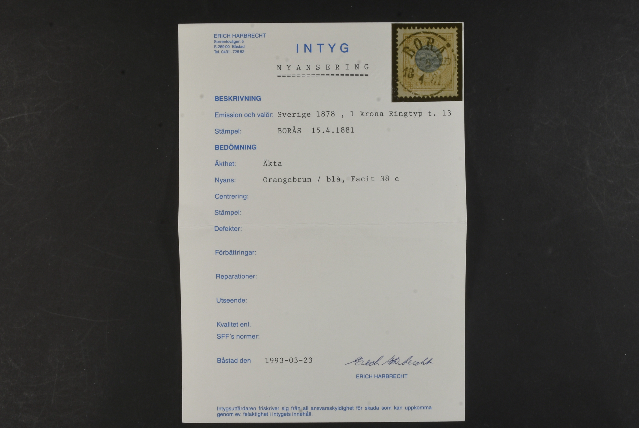 Sweden. Facit 38c used, 1 Krona orange-brown/blue. EXCELLENT cancellation BORÅS 15.4.1881. Opinion (shade) by Erich Harbrecht (1993).