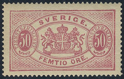 Sweden. Official Facit Tj22A ★★, 50 öre red, perf 13, type I. Very fine quality. SEK 5000