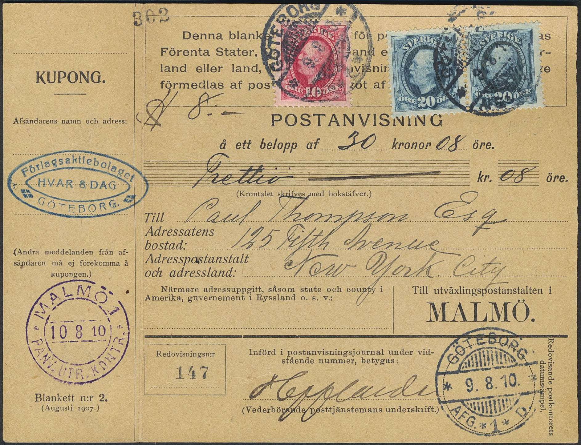 Sweden. Facit 54, 56 on cover, 10+2×20 öre on list money order sent from GÖTEBORG 9.8.10, for the exchange to USA.