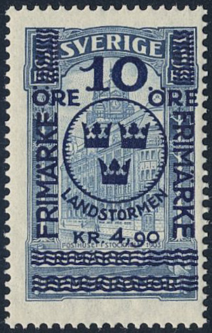 Sweden. Facit 125 ★★, 1916 Landstorm II 10+4,90 / 5 kr blue. Very fresh. SEK 1800