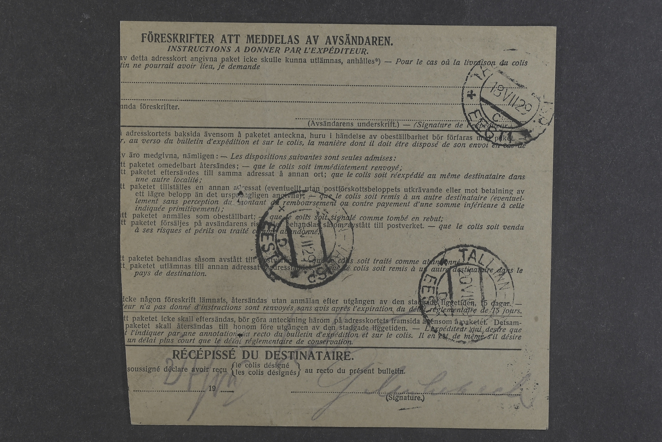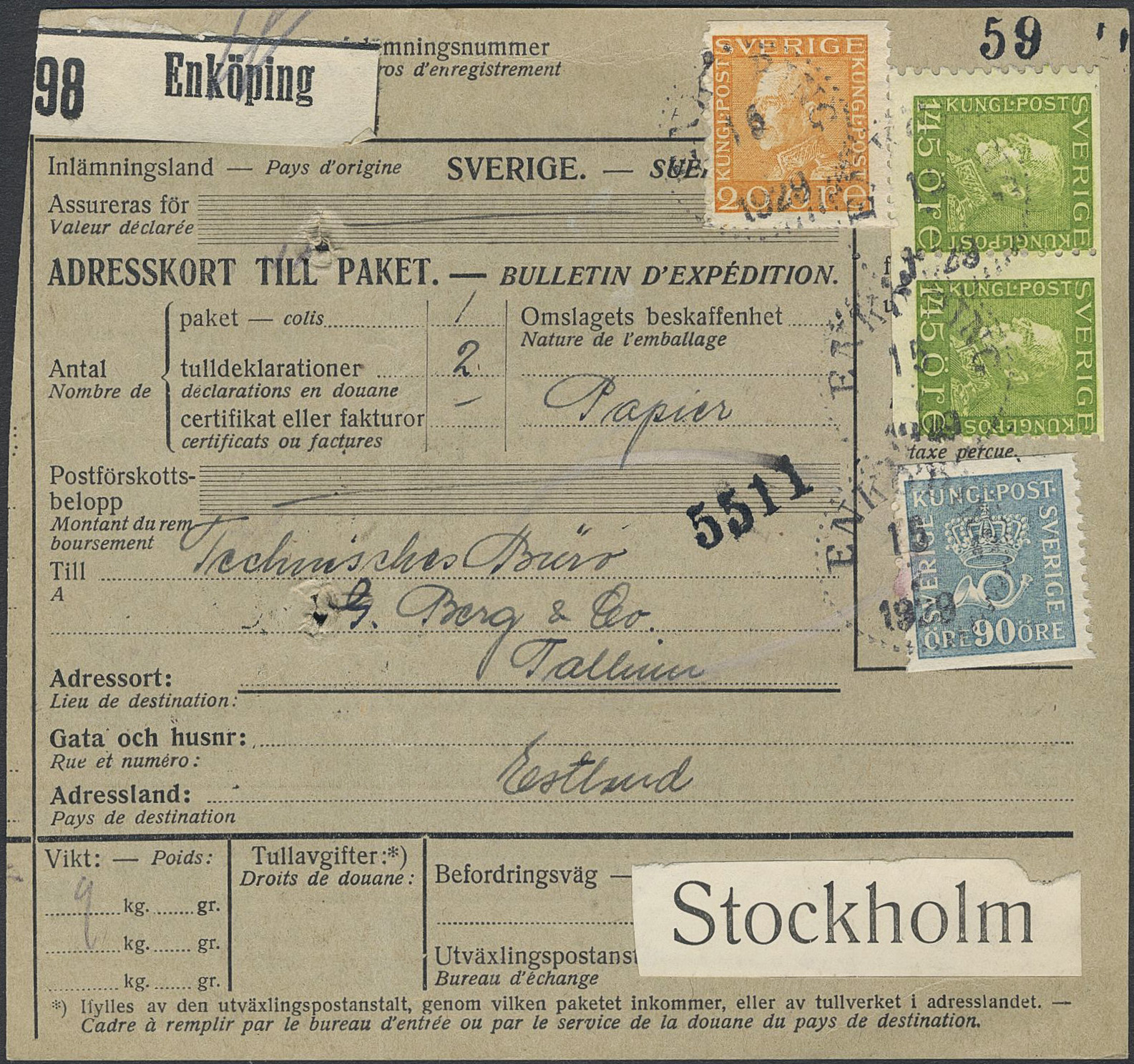 Sweden. Facit 195, 167, 181 on cover, 20+90+2×145 öre on address card for parcel sent from ENKÖPING 16.7.1929 to Estonia.
