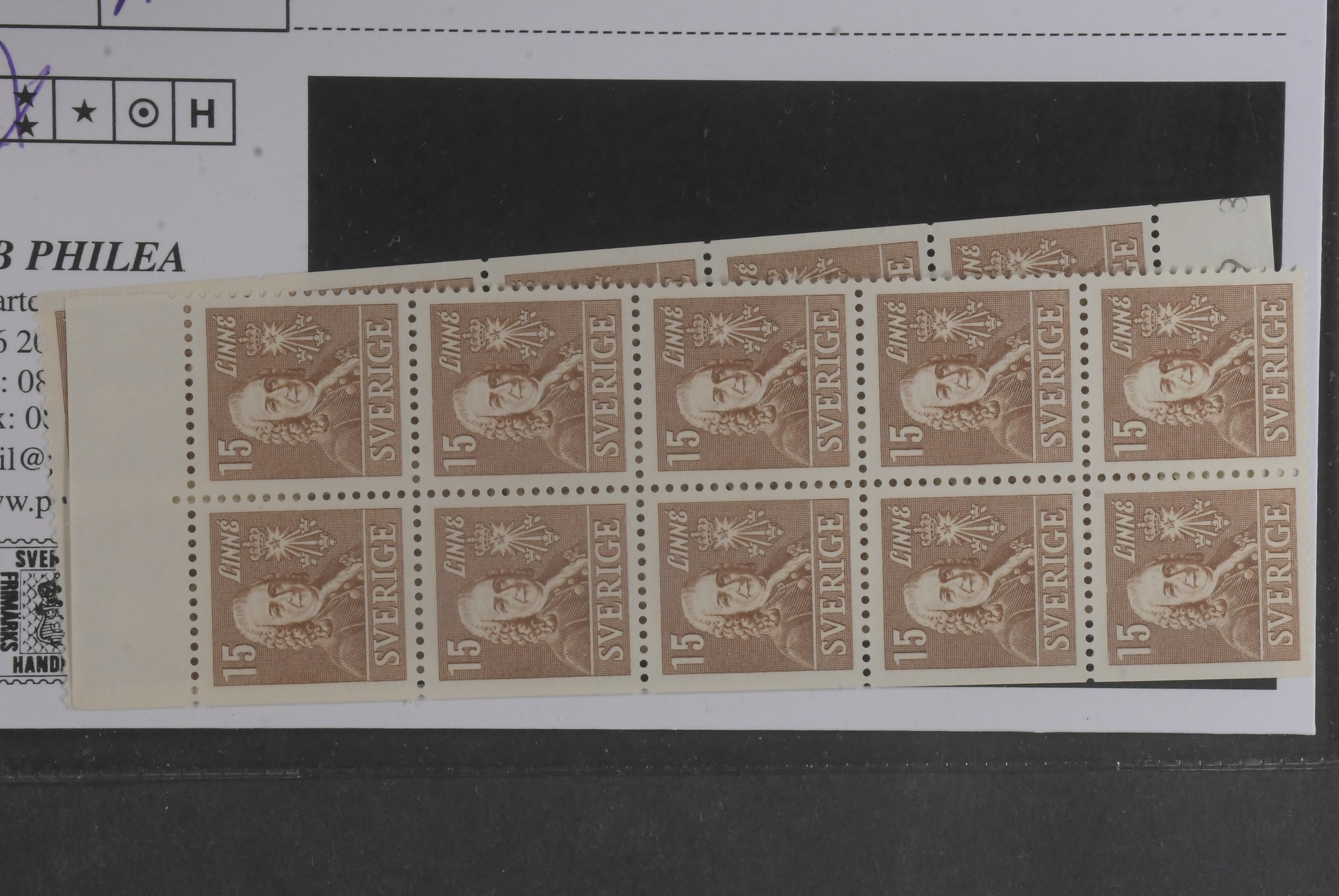 Sweden. Facit 321BC/CB ★★, 1939 Royal Academy of Sciences 15 öre brown, pair 3+4 and 4+3. 5 pairs of each in strips. SEK 17000