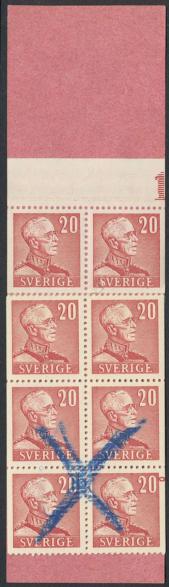 Sweden. Booklet Facit H61, Stamp booklet 20 öre Gustaf V, right profile. Probably not approved by the post, crossed out with blue chalk, due to red circle in the right margin. A small damage to the top stamp to the right in the booklet.