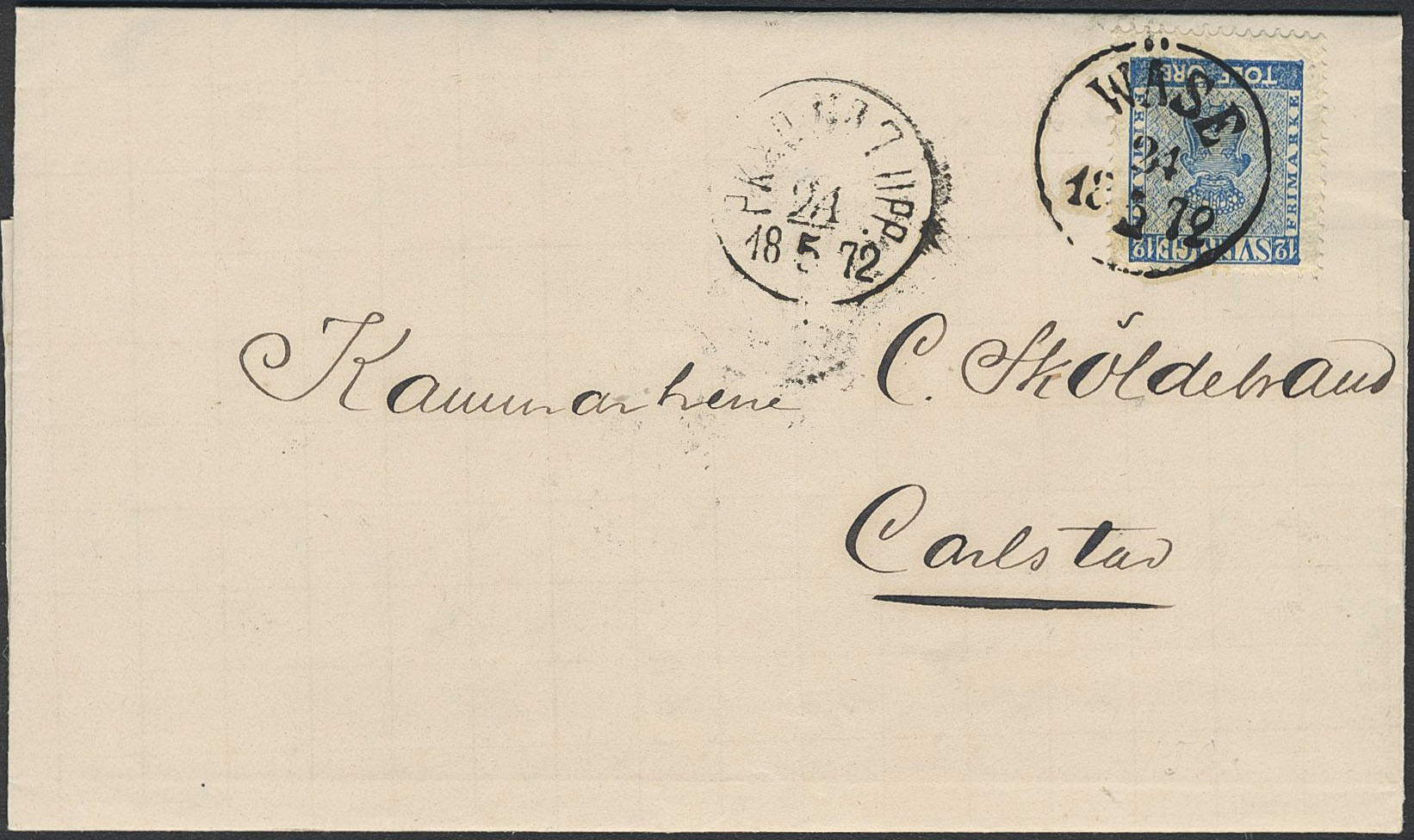 Sweden. Facit 9, S county. WÄSE 24.5.1872, circle cancellation. Beautiful cover sent via PKXP Nr 7 UPP 24.5.1872 to Karlstad. Postal: 350:-