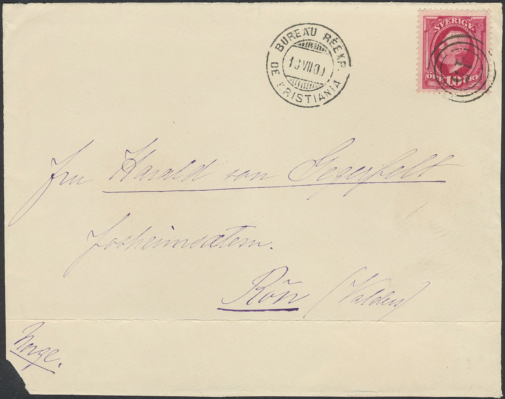 Sweden. Facit 54. Cancellations,. Norwegian numeral cancellation 45 (Strömstad–Halden) together with BUREAU RÉEXP DE KRISTIANIA 13.VII.00 on cover front sent to Røn, Norway.