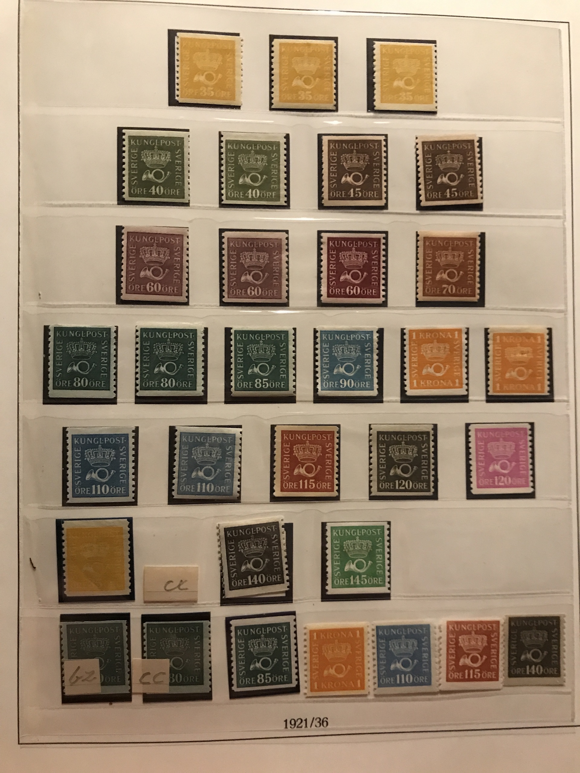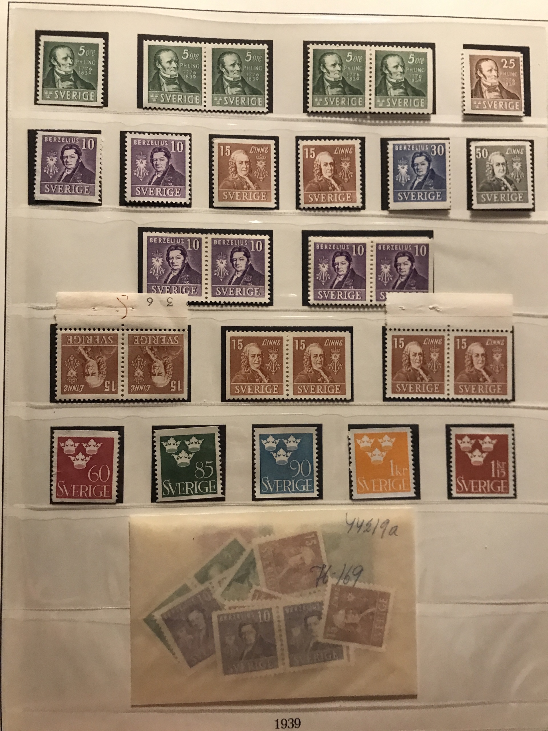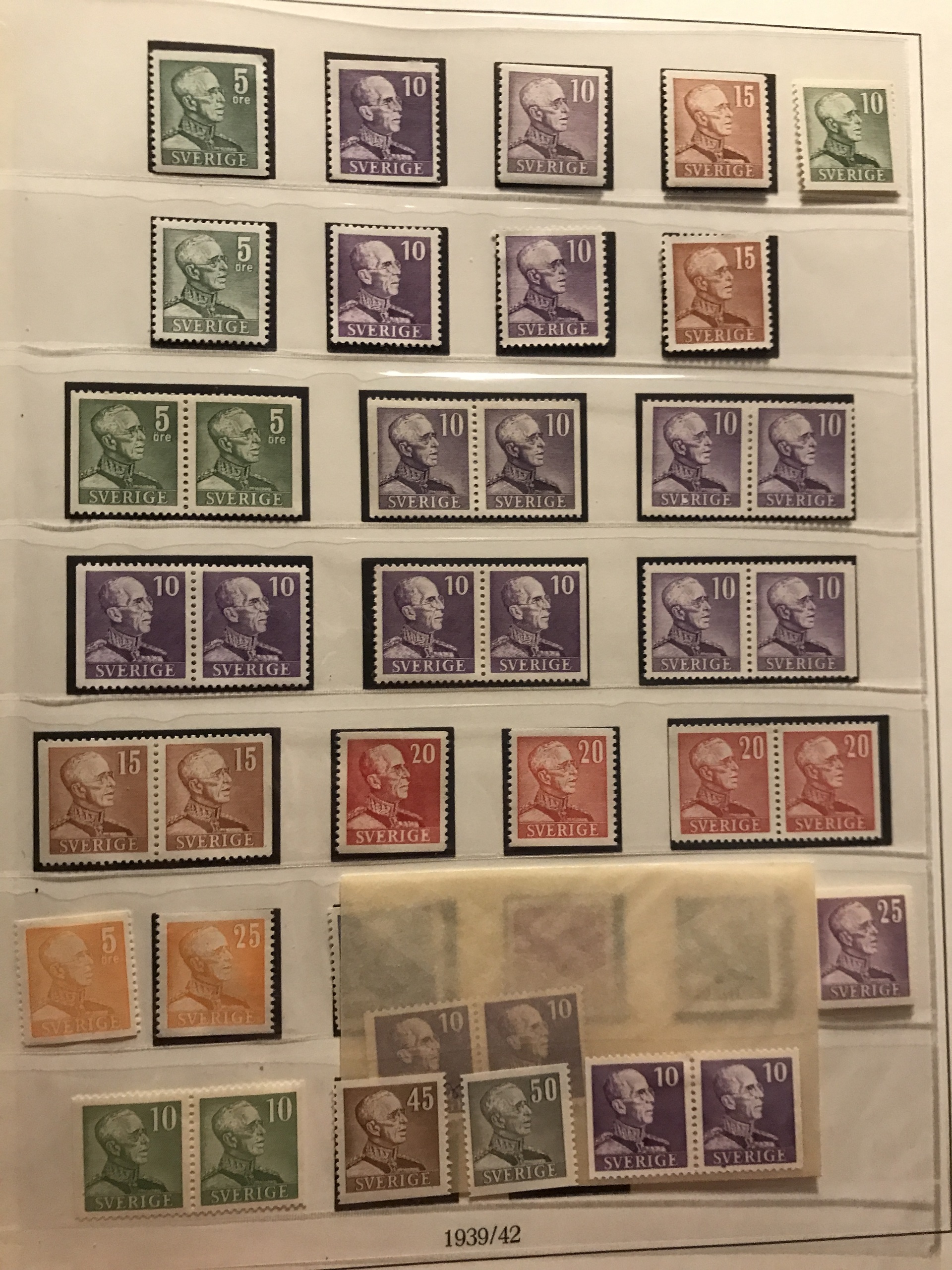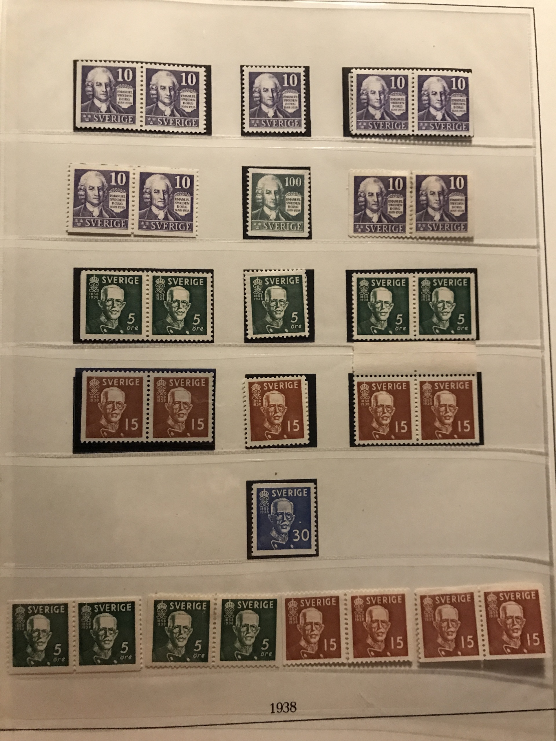 Sweden. ★★/★. Collection until 1945 in Lindner album incl. e.g. F1–2 and 5–6N, good Coat-of Arms and Lion types incl. some (*), nice Circle types, cpl. Oscar, F65 *, a weel-filled section Coil stamps mainly *, cpl. Landstorm, Congress and UPU incl. some **, F233b **, 22 ** BC/CB-pairs and 332BC+CB *, 337C**, some better officials- and postage due stamps, etc. Please see a selection of scans at www.philea.se. Mostly fine quality.
